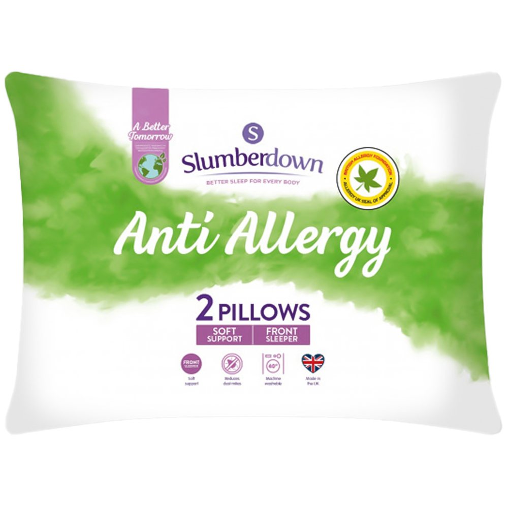 The pillows in this Slumberdown Anti Allergy Soft Support Front Sleeper Pillow 2 pack are specifically made with an anti-allergy filling to help reduce the build-up of dust mites, bacteria and fungus. They’re an ideal choice for allergy sufferers and all-year-round use. The lovely and snuggly hollow fibre filling is soft and comfortable, and the luxury microfibre cover feels wonderful to sink into. Having a soft support level, this anti-allergy pillow pair is a great choice for front sleepers, or for those who prefer a more shallow, soft pillow.