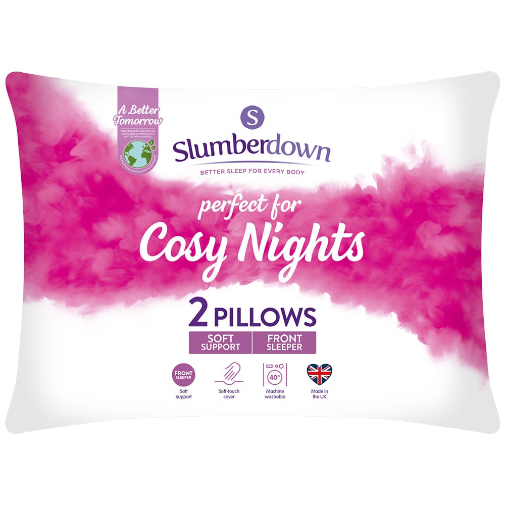 This Slumberdown Cosy Nights Pillow Pair Soft is perfect for people who sleep on their front. This soft support pillow aligns your body for a great night's sleep and is tailored to your sleeping position. Offering gentle support, this pack of two pillows are ideal for cosy nights and has a soft touch cover for extra comfort so you can get a great night's sleep.