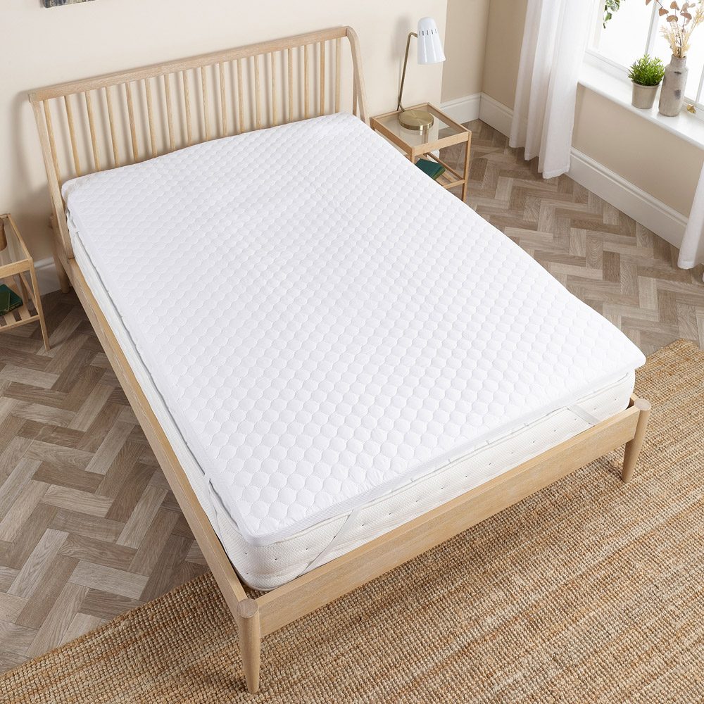 Experience comfort and coolness with the Slumberdown Double Airstream Mattress Topper. This mattress topper uses advanced Airstream technology to keep you cool, dry, and asleep all night. It provides the best airflow while you sleep by using breathable fibres and having a ventilated central area. Plus, the mattress's 4cm depth offers medium support and gently conforms to the curvature of the spine, making it ideal for people who prefer a medium firmness. It improves comfort and helps lessen aches and pains by increasing the life of a mattress. The topper secures the bed with elasticated straps and a removable cover for uninterrupted sleep.