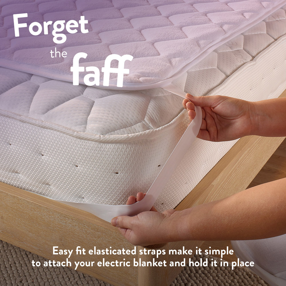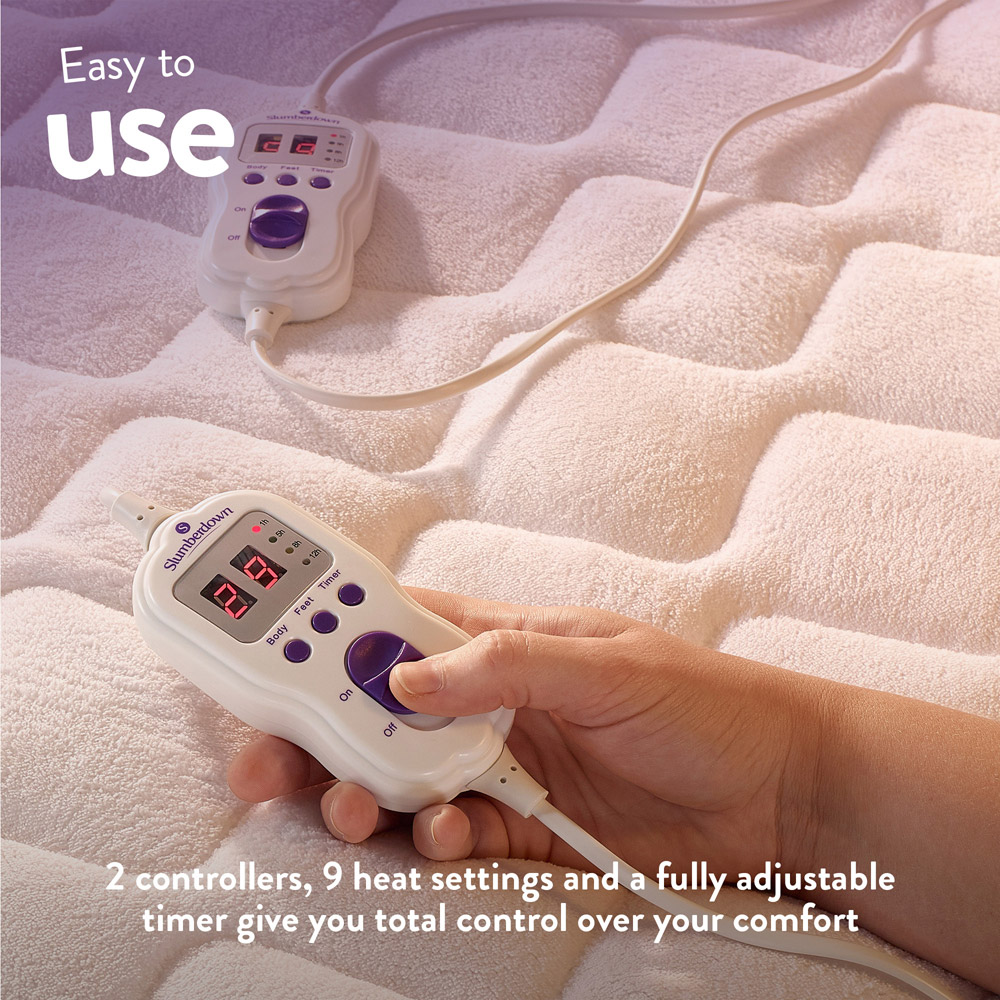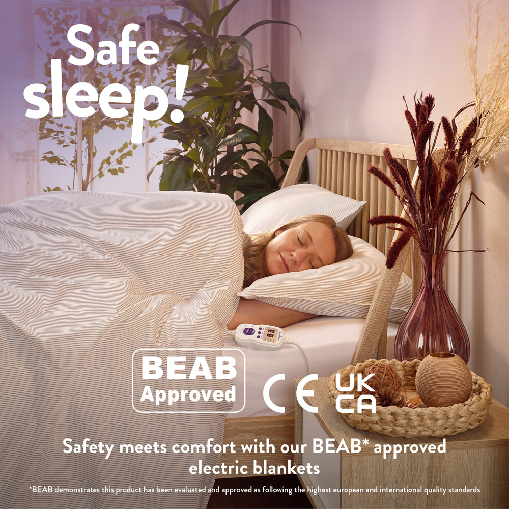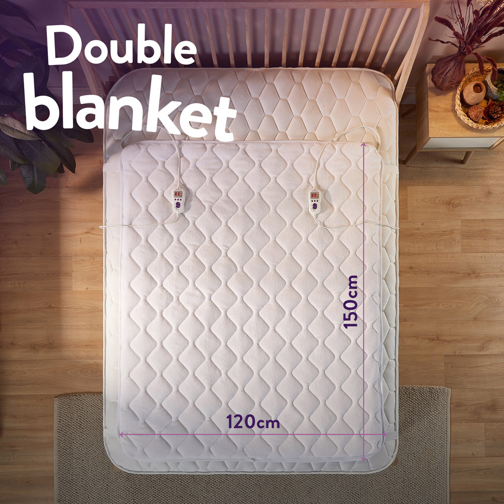 Experience the epitome of warmth and luxury with the Slumberdown Wonderfully Warm Electric Blanket Double Bed. When the chill of the outside world creeps in, this blanket becomes your cosy haven, enveloping you in indulgent comfort and soothing warmth. Prepare for a world of relaxation as you sink into the deep-filled quilted fleece cover. Its sumptuous texture not only provides unparalleled warmth but also offers a soothing embrace for those recovering from illness or injury. Let the softness envelop you, transporting you to a realm of pure tranquillity. Customize your comfort with nine temperature options and four timer settings. With zonal heating that targets different areas of your body, including separate settings for your feet, you can create your oasis of cosiness. Equipped with reinforced elasticated straps, it stays securely in place on your mattress, accommodating depths of up to 35cm. The safety system includes an automatic shut-off feature and a timer, providing peace of mind as you drift off into a restful slumber. Not only does this electric blanket provide exceptional comfort and safety, but it's also energy-efficient, helping you save on those overnight heating bills. With an average use of 8 hours, it costs as little as 1p per night. Keeping your blanket fresh and clean is a breeze. Simply remove the mains lead and toss the entire blanket into the washing machine. For added convenience, it comes with a reusable storage bag, keeping it neat when not in use. Rest assured, this electric blanket bears the prestigious BEAB mark of approval and comes with a 2-year complete guarantee. Upgrade your nights and embrace the warmth, comfort, and convenience of your double bed.