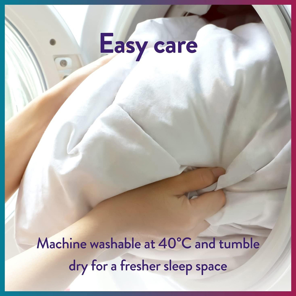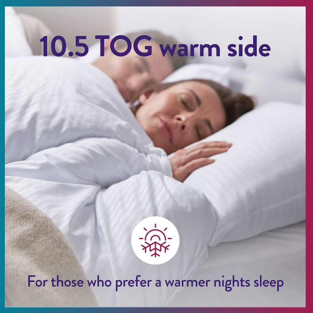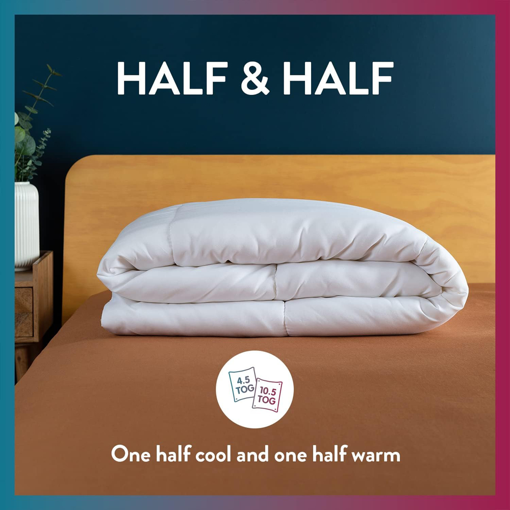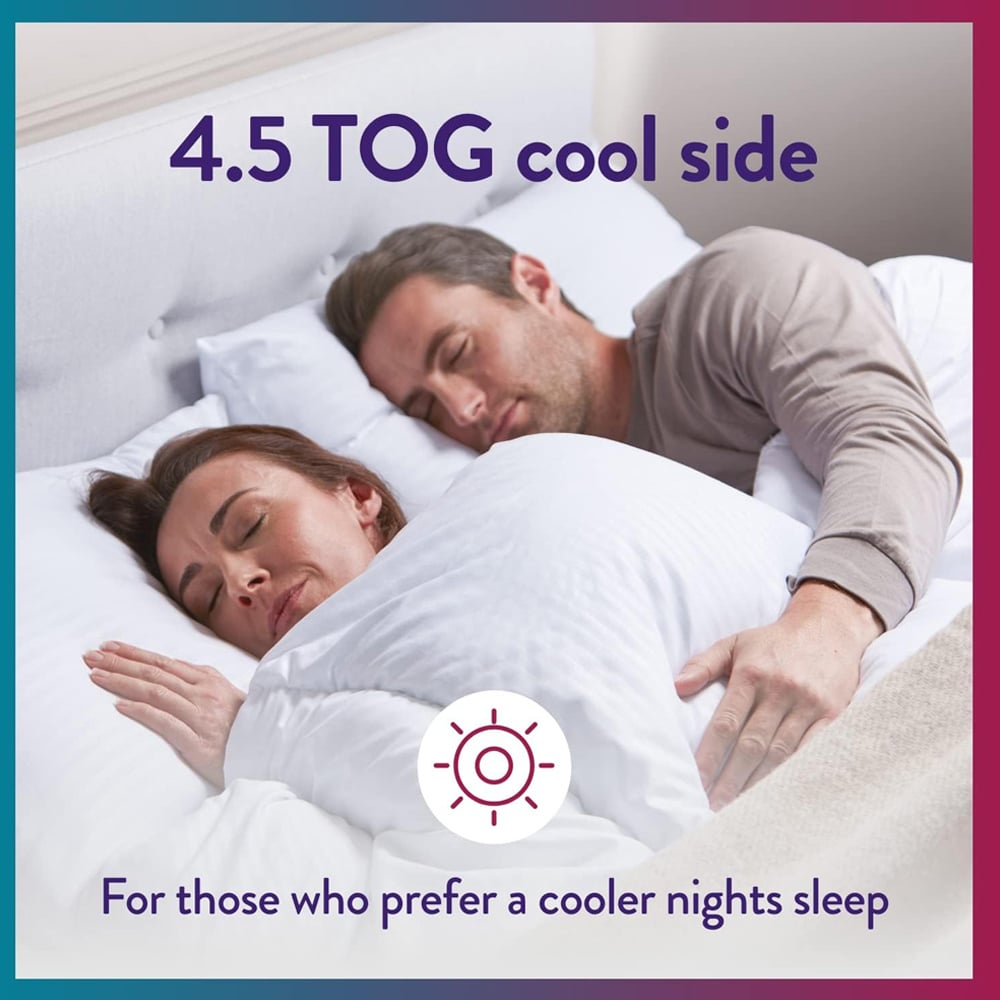 Experience the ultimate sleep harmony with the Slumberdown Made for You Two King Bed Duvet. This king duvet with dual-tog technology is an innovation for partners who prefer different sleeping temperatures. Its clever construction has two reversible sides (cool 4.5Togs and warm 10.5Togs). One can easily adjust the level of warmth to suit their requirement. The 10.5Tog side wraps you with a heavier filling for a cosier, warmer embrace. The 4.5Tog side has a lightweight filling for a delightfully refreshing sensation. This duvet is easy to clean as it is washing machine and dryer friendly. Also, it assures the couple a peaceful sleep with its soft-touch cover and hypoallergenic hollow fibre filling.