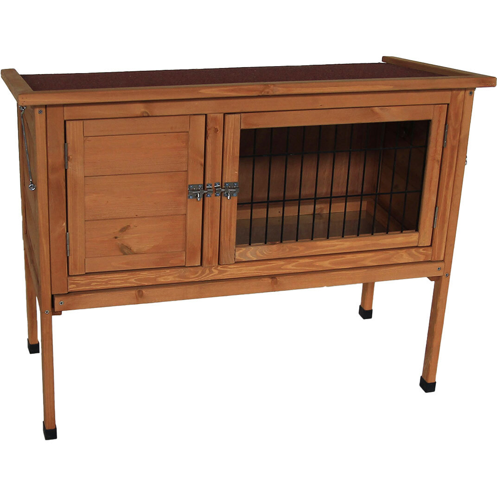 Keep your pet happy and safe with the brilliant Raised Small Animal Hutch. This wonderful hutch will make the perfect home for your furry friend, keeping them safe. The large hutch consists of a single hutch with a hinged roof, solid base and two doors with two compartments, allowing your pet a separate place to sleep. One door is solid giving your pet shelter and the other has a wood frame with strong wire mesh, and both securely lock using a bolt. The lift up roof is hinged so it is easy to raise while you clean out the hutch, and it includes a plastic tray. It features legs that raise the hutch high from the ground, protecting your pets from predators.