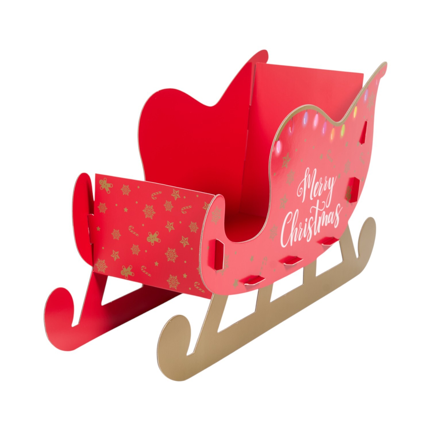 Add festive charm and creativity to your celebrations with the Small Make Your Own Sleigh Hamper. This delightful kit includes all the components to assemble a cheerful mini sleigh, beautifully finished in vibrant red with 'Merry Christmas' lettering and playful winter motifs. Its compact size makes it perfect for storing party favours, small gifts, sweets or decor accents.