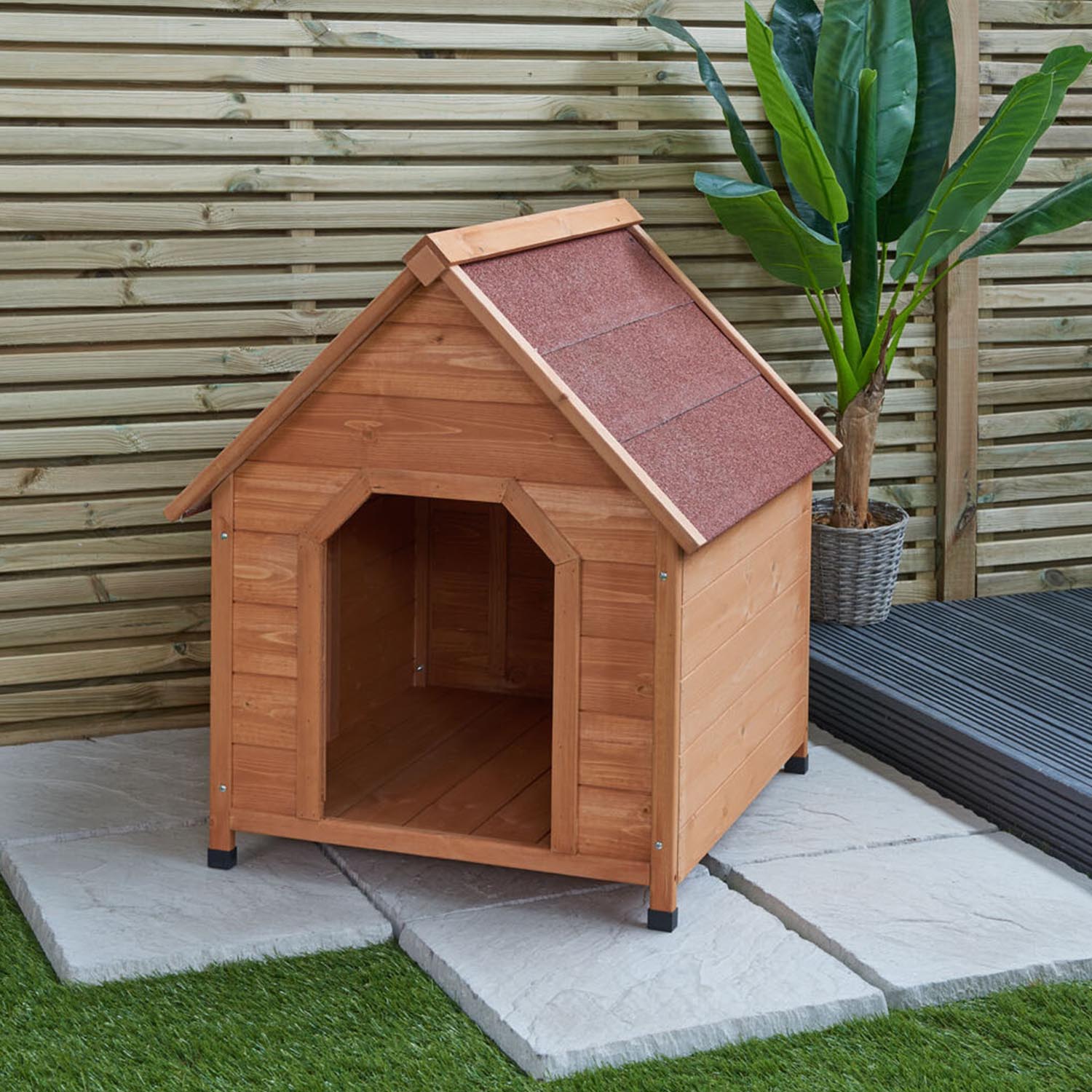 Keep your pet warm and dry with this gorgeous Wooden Pet Kennel. This delightful kennel is constructed of solid wood and makes the perfect shelter for your furry friend while outside. The felt, apex roof protects against water damage and the beautiful design makes this kennel a lovely garden feature as well as a comfy home for your pooch. It's a must-have for any dog owner and is sure to become of your dog's favourite places to relax and nap.