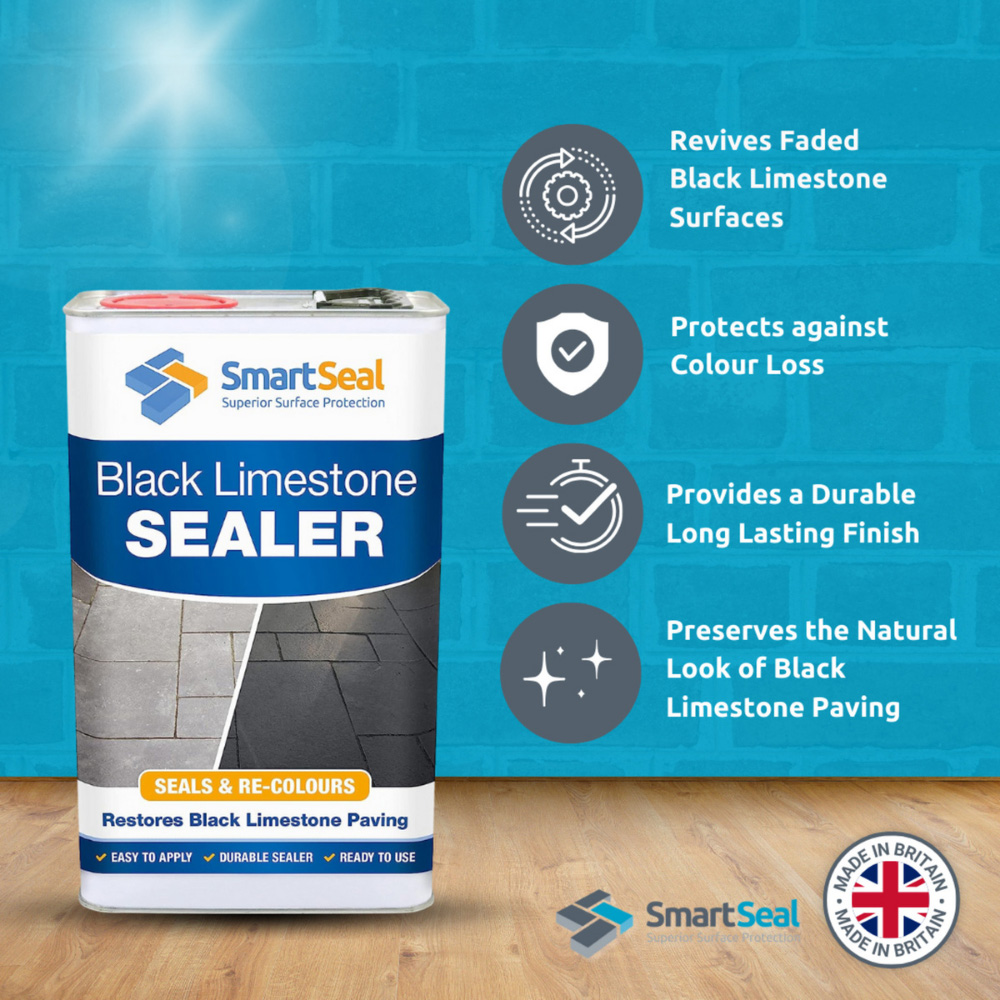 Transform your black limestone surfaces with the SmartSeal Black Limestone Sealer, a highly effective solvent-based sealer and re-colourant. This black limestone sealer gives a magnificent jet-black finish that not only covers the surface but also protects it from moss, algae and lichens. It's easy to maintain, and with minimal effort, you can enjoy a beautifully preserved limestone surface for years to come. Instead of having to frequently clean your limestone or slate patio, maintenance is easy once applied. Simply hose it down and sweep it every three months, and your surface will always look great. The sealer does more than just protect; it rejuvenates and recolours your faded limestone and slate. You'll be amazed as your faded patio returns to the captivating jet black of its first day, breathing new life into your limestone or slate surfaces. Plus, it's easy to reapply, ensuring your black limestone and slate patios or paths always look their best. Application guidelines: Clean the surface of your limestone or slate patio using a pressure washer, then let it dry thoroughly for at least 72 hours. Apply two coats of this sealer with a roller, ideally in temperatures between 12°C and 23°C. Quantity: 1L.