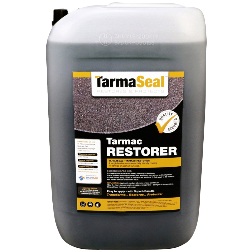 Revive the brilliance of your driveway with this SmartSeal Black Tarmac Restorer. This is a fantastic, easily applied tarmac restorer for surfaces such as driveways, car parks, playgrounds and tennis courts. It's vastly superior to a tarmac paint as it offers a cost-effective alternative solution which can be used instead of resorting to a full replacement of a tarmac surface. This product is solvent-free whilst still offering long-term protection against staining and fungicidal or algae growth. It will also reduce the future need for repair of the surface and cover unsightly oil and cement stains. Instructions for use: 1. Ensure that the tarmac is completely clean from dirt and grime. 2. Allow three to four dry days between cleaning and sealing. 3. Apply two coats of the restorer to the surface using a roller. 4. Allow two to four hours in between coats. Quantity: 20L.