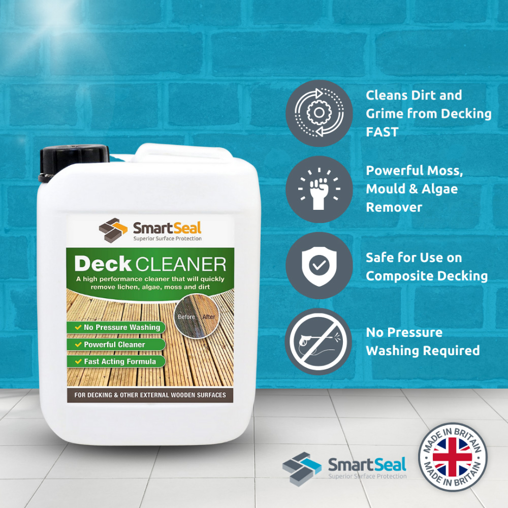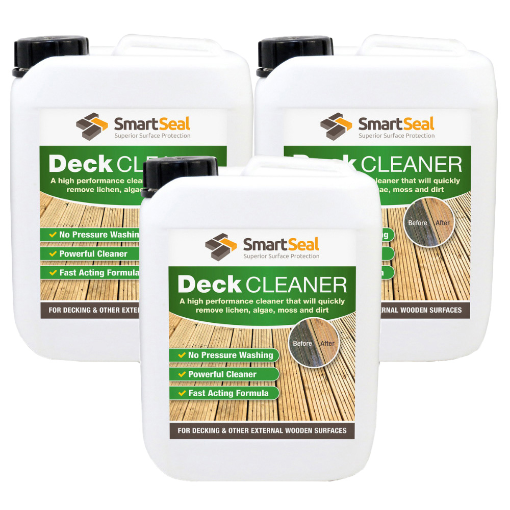 Restore your home's charm with this SmartSeal Deck Cleaner. This deck cleaner is a professional-grade cleaning product that transforms the look of any old and tired-looking surface. It offers the simplest and most effective method of keeping your surface completely cleaner without any intense pressure washing. It has four powerful active ingredients that quickly remove black spots, algae, lichens, moss and dirt from all types of decking and wood. Quantity: 5L. Pack of three.