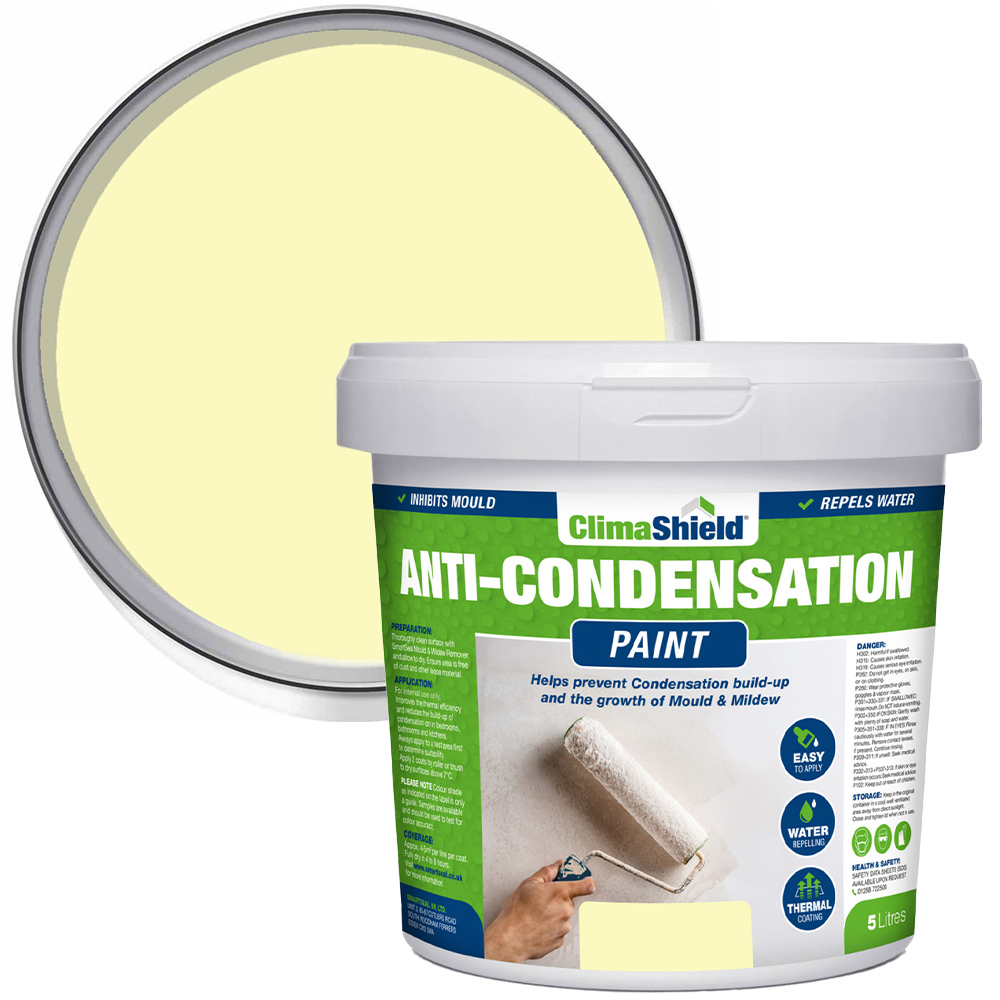Upgrade your walls in a classy way with this 5L Anti-Condensation Paint by SmartSeal. This devon cream-coloured paint delivers a beautiful finish and acts as a potent anti-mould barrier, safeguarding your home against unwanted growth. It can also significantly reduce condensation levels up to a staggering 95% and will keep your living spaces fresh and free from harmful moisture build-up. Its anti-mould properties eliminate all the harmful allergens and contaminants, ensuring fresher, cleaner air in your bathrooms and bedrooms. This paint is suitable for use in bathrooms, kitchens and bedrooms, where it can help prevent the growth of black spot mould. It is also ideal for use in properties with low insulation levels or on cold external-facing walls.