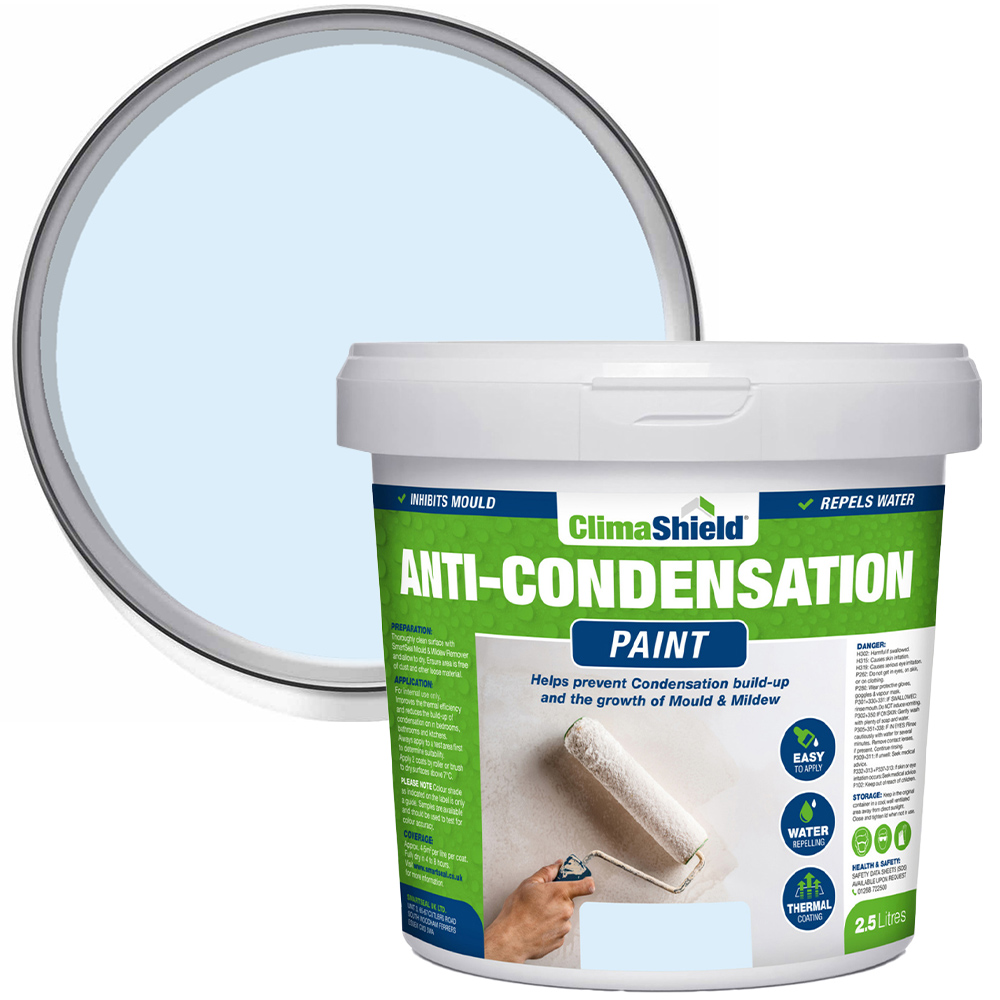 Upgrade your walls in a classy way with this 2.5L Anti-Condensation Paint by SmartSeal. This frosted blue-coloured paint delivers a beautiful finish and acts as a potent anti-mould barrier, safeguarding your home against unwanted growth. It can also significantly reduce condensation levels up to a staggering 95% and will keep your living spaces fresh and free from harmful moisture build-up. Its anti-mould properties eliminate all the harmful allergens and contaminants, ensuring fresher, cleaner air in your bathrooms and bedrooms. This paint is suitable for use in bathrooms, kitchens and bedrooms, where it can help prevent the growth of black spot mould. It is also ideal for use in properties with low insulation levels or on cold external-facing walls.