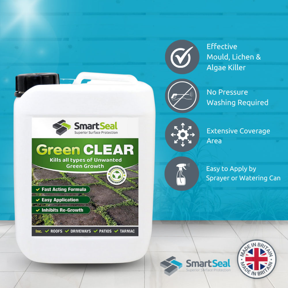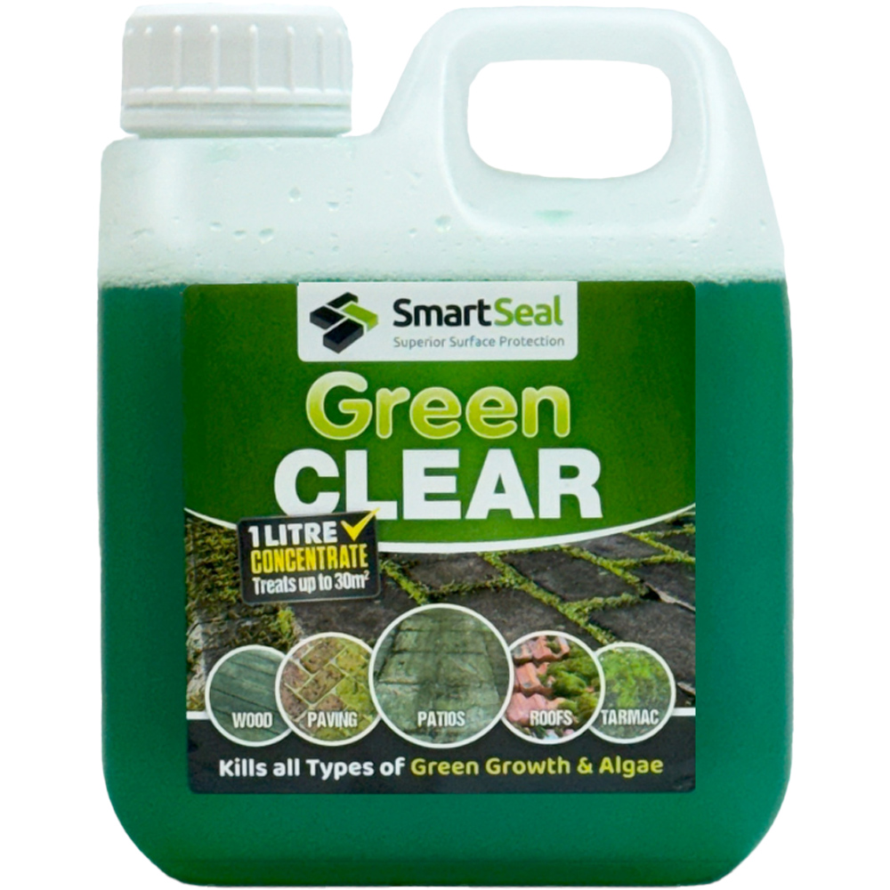 Protect your patios with this One-Litre Green Clear by SmartSeal. This Green Clear is a potent, highly effective microbiological biocide that, once applied, will quickly start to rid the area of most types of green organic growth on external hard surfaces. This easy-to-apply formulation is suitable for controlling and removing organic growth, algae, mould, and the various types of lichen often found on driveways, patios, roofs, walls and paths. You can also reapply it at any time to help prevent the reappearance of these various species of organic growth and keep external hard surfaces looking clean. With 1L of SmartSeal Green Clear, you'll get an impressive 30m2. Depending on the thickness of the organic growth, an extra application may be required. It can be used as a watering can or pump sprayer for a hassle-free application. After cleaning the surface, spray this product (when dry) to inhibit further growth and ensure long-lasting results.