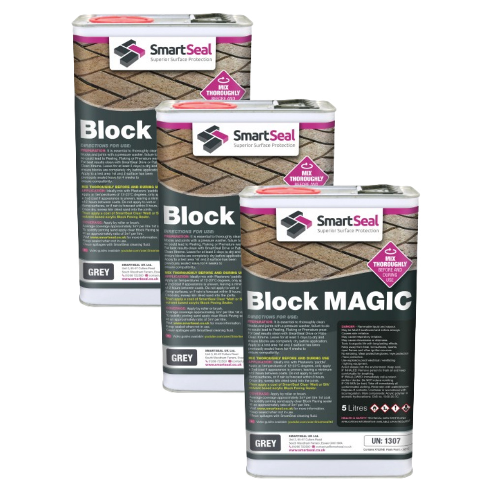 Don't let the elements steal your patio's smile with the SmartSeal Grey Block Magic. This coloured block paving sealer is the ultimate solution to restore or change the colour of your block paving. Don't let everyday weather or pressure washing cause your paving to lose its vibrant colour. This blend of acrylic resins and liquid pigments will soak deep into your paving, completely renovating and adding protection to your patios and driveways. Say goodbye to tired appearances and welcome a rejuvenated, eye-catching aesthetic that will leave a lasting impression. With an impressive coverage of 3m2 per litre, this product goes a long way. Simply apply one coat using a brush or roller, allow it to dry, re-sand the joints, and then apply a sure-to-please second coat of our clear sealer. Bid farewell to block paving paints and witness the fascinating transformation as your block paving undergoes a stunning makeover, resembling a pristine, brand-new surface. Application guidelines: Ensure a test area is used before full application. Ensure paving is pressure washed to remove all surface debris and muck from joints. Leave paving to dry for three to four clear and dry days. Apply one coat of Block Magic with a roller. If you're changing the colour you may need to apply two coats (coverage in the description). Leave Block Magic to fully cure for one to two clear and dry days. Re-sand the surface area. Quantity: 5L. Pack of three.