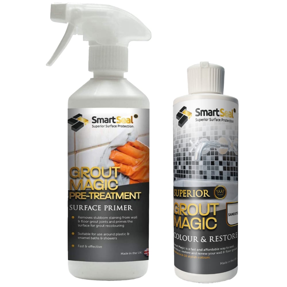 Transform your grouts in style with this Grout Magic Bundle by SmartSeal. This Grout Magic bundle is an effective dye that can restore or change the colour of your grout. It acts as a sealer that penetrates deeply into the grout and will dramatically enhance the appearance of any wall or floor tile. This bundle features a 500ml bottle of surface primer and a 237ml bottle of Grout Magic in sandstone colour. Once applied and fully cured, this Grout Magic can enhance your grout by giving it a long-lasting protective seal. It will also inhibit the growth of mould & mildew on the tile grout.