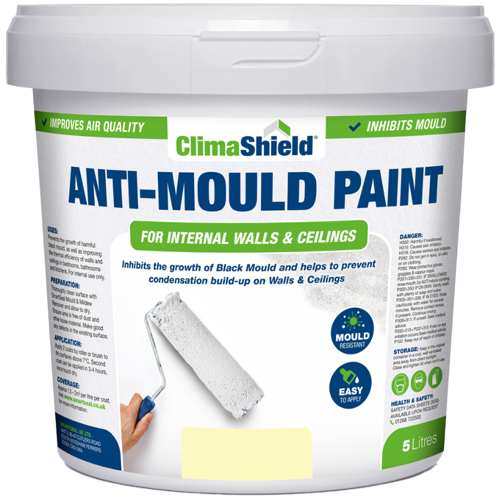 Upgrade your home walls in a classy way with this 5L Anti-Mould Paint by SmartSeal. This light yellow-coloured paint offers a matt finish once applied and is specially formulated to help prevent the growth of dangerous mould, mildew and algae within the home. The active fungicide within the anti-mould paint helps to stop any mould or mildew from germinating and spreading, which can be very harmful to health, especially to anyone with breathing difficulties. This paint has a solvent-free low VOC formulation which also helps to improve air quality. It can also be used as an effective mould-resistant paint or membrane on floors, walls and ceilings in bedrooms, bathrooms, kitchens & and basements.