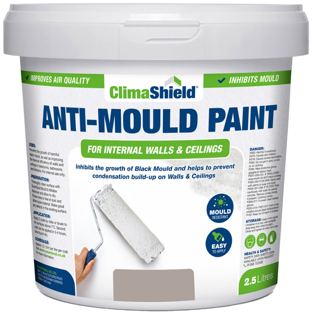Upgrade your home walls in a classy way with this 2.5L Anti-Mould Paint by SmartSeal. This medium grey-coloured paint offers a matt finish once applied and is specially formulated to help prevent the growth of dangerous mould, mildew and algae within the home. The active fungicide within the anti-mould paint helps to stop any mould or mildew from germinating and spreading, which can be very harmful to health, especially to anyone with breathing difficulties. This paint has a solvent-free low VOC formulation which also helps to improve air quality. It can also be used as an effective mould-resistant paint or membrane on floors, walls and ceilings in bedrooms, bathrooms, kitchens & and basements.