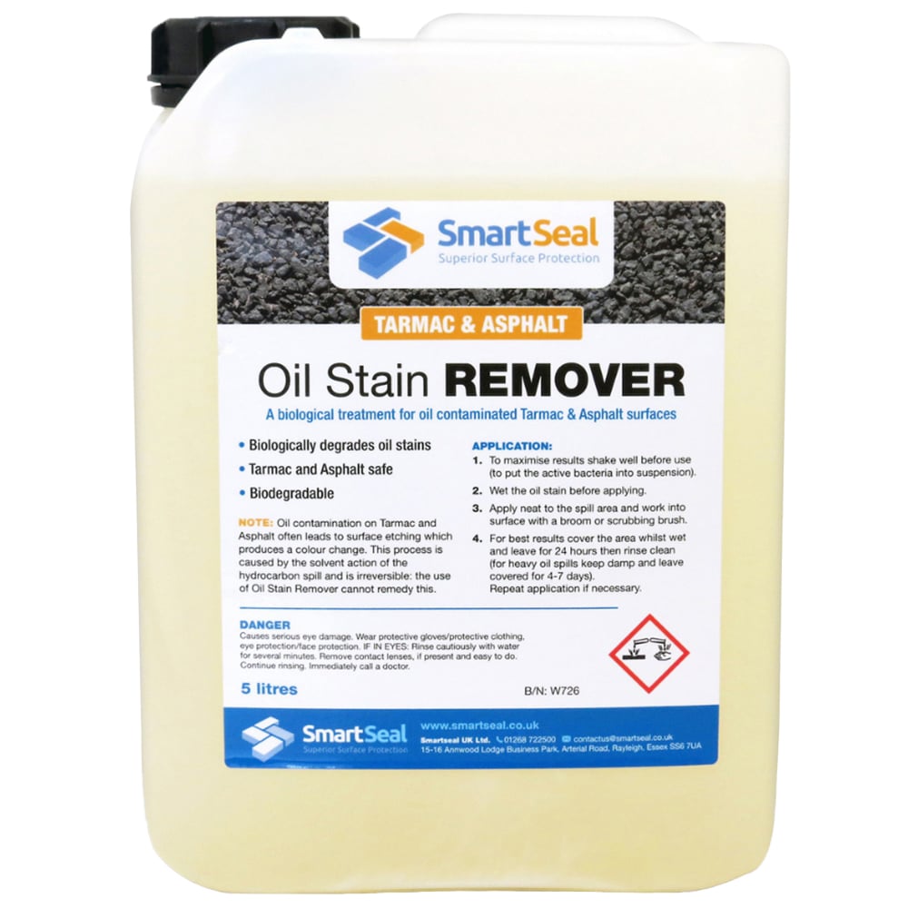 Unleash the power of a spotless driveway with this SmartSeal Oil Remover for Tarmac Asphalt, a biological oil stain remover that rapidly removes and digests oil contamination. It does not erode or degrade tarmac or asphalt surfaces. Instructions for use: 1. Shake the container before use (to put bacteria into suspension). 2. Water wet the oil stain before applying the oil remover. 3. Apply neatly to the oil stain, brush in and leave for one hour. For bad or old stains, apply the product and cover the affected area for a few days before removal. 4. Water rinse to remove residue, and if required, use absorbent powder to prevent oil spills to surface drains. Sweep up and dispose of it according to local regulations. Note: Oil stains degrade tarmac and asphalt, leaving behind an etched surface which appears as a dark stain that cannot be removed. Use tarmac sealer to coat residual staining from oil damage to the surface of the tarmac. Quantity: 5L.