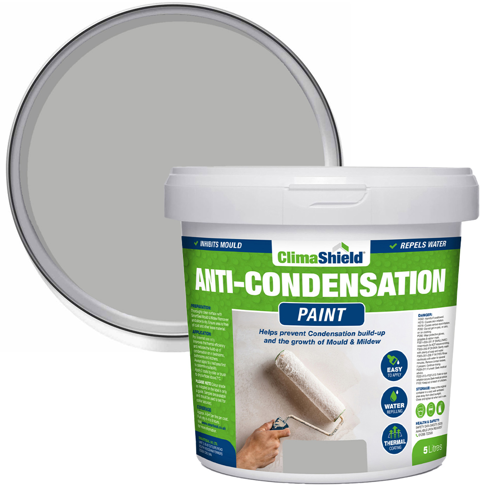 Upgrade your walls in a classy way with this 5L Anti-Condensation Paint by SmartSeal. This pale slate-coloured paint delivers a beautiful finish and acts as a potent anti-mould barrier, safeguarding your home against unwanted growth. It can also significantly reduce condensation levels up to a staggering 95% and will keep your living spaces fresh and free from harmful moisture build-up. Its anti-mould properties eliminate all the harmful allergens and contaminants, ensuring fresher, cleaner air in your bathrooms and bedrooms. This paint is suitable for use in bathrooms, kitchens and bedrooms, where it can help prevent the growth of black spot mould. It is also ideal for use in properties with low insulation levels or on cold external-facing walls.