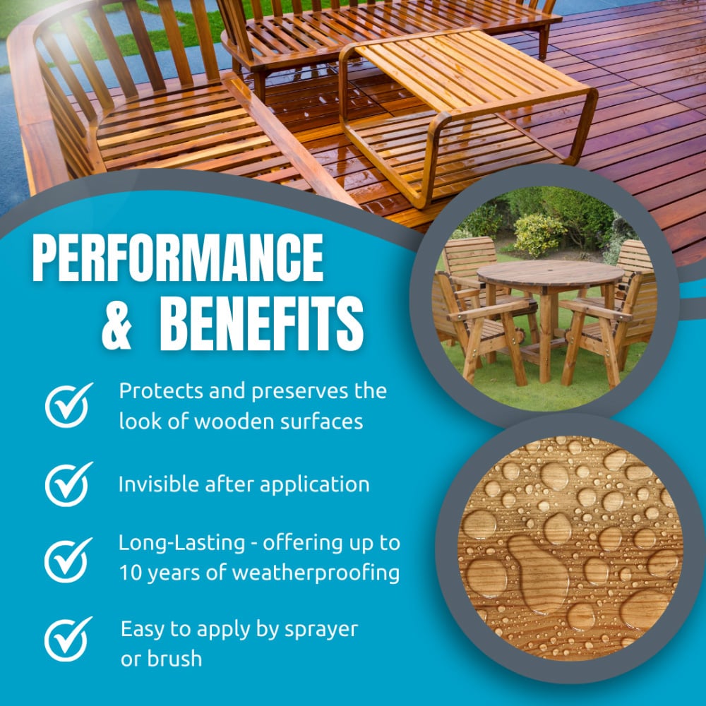 Protect your wooden surfaces with the SmartSeal Wood Sealer. It is a professional-grade sealer specially designed to create an invisible waterproof barrier. This barrier helps prevent the ingress of moisture on pressure-treated softwoods such as fences, sheds, garden furniture and decking. This wood sealer is specially formulated to protect your outdoor wooden surfaces for up to ten years. The water-resistant surface will also inhibit the growth and spread of mould and algae, which is a big problem with softwoods, especially in shaded north-facing areas of locations with high levels of rainfall. To ensure the best results, all wooden surfaces should be thoroughly cleaned before the application of this wood sealer.
