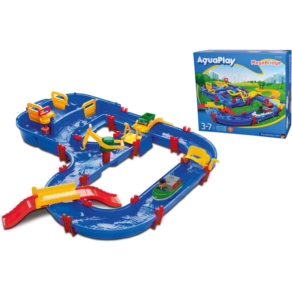 With the Smoby Aquaplay Mega Bridge, the water canal system will keep the children occupied for hours and hours! Let captain Bo navigate the transport boat through the lock, into the harbour and finally dock the boat in the marina. Or, take the amphibian car out for a ride! It can go from land to water, cross the mega bridge into the set where the crane will assist to load containers onto the vehicle. By turning the paddle the water will be set into motion in the canals, a playful way of educating how water moves! There are also indefinitely expandable options, either by other Aquaplay sets or extensions! The mega bridge has three play stations and is 105x120cm when assembled. It has 49 pieces including a transport boat, two containers, an amphibian truck and a Bo the Bear figure. Suitable for children of age three and above.
