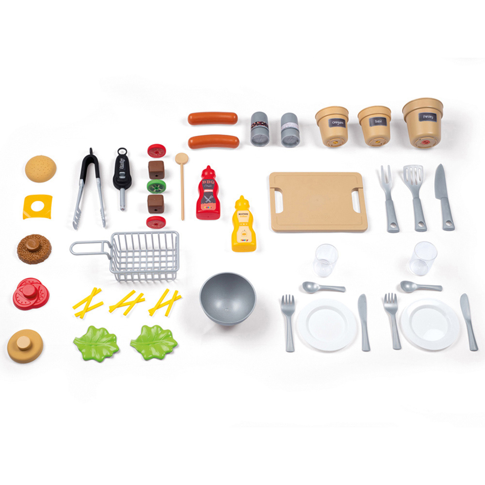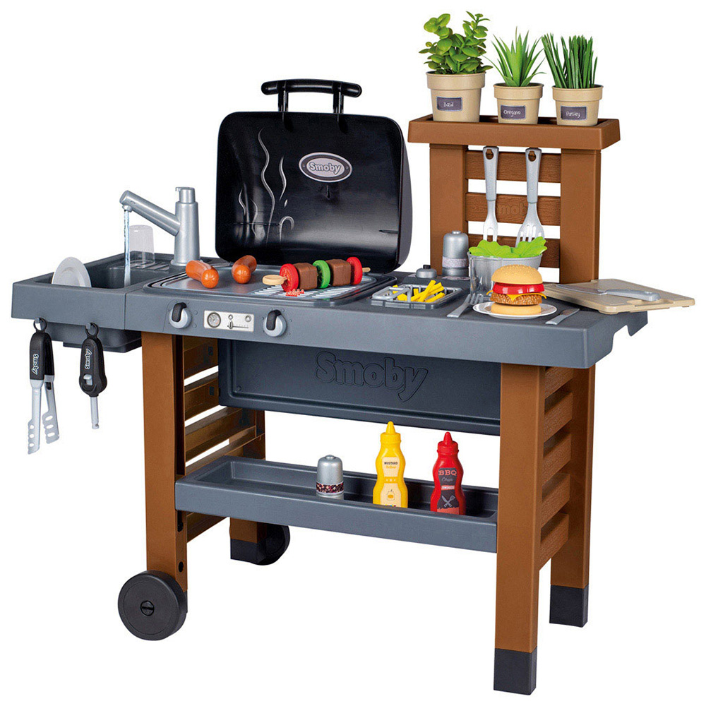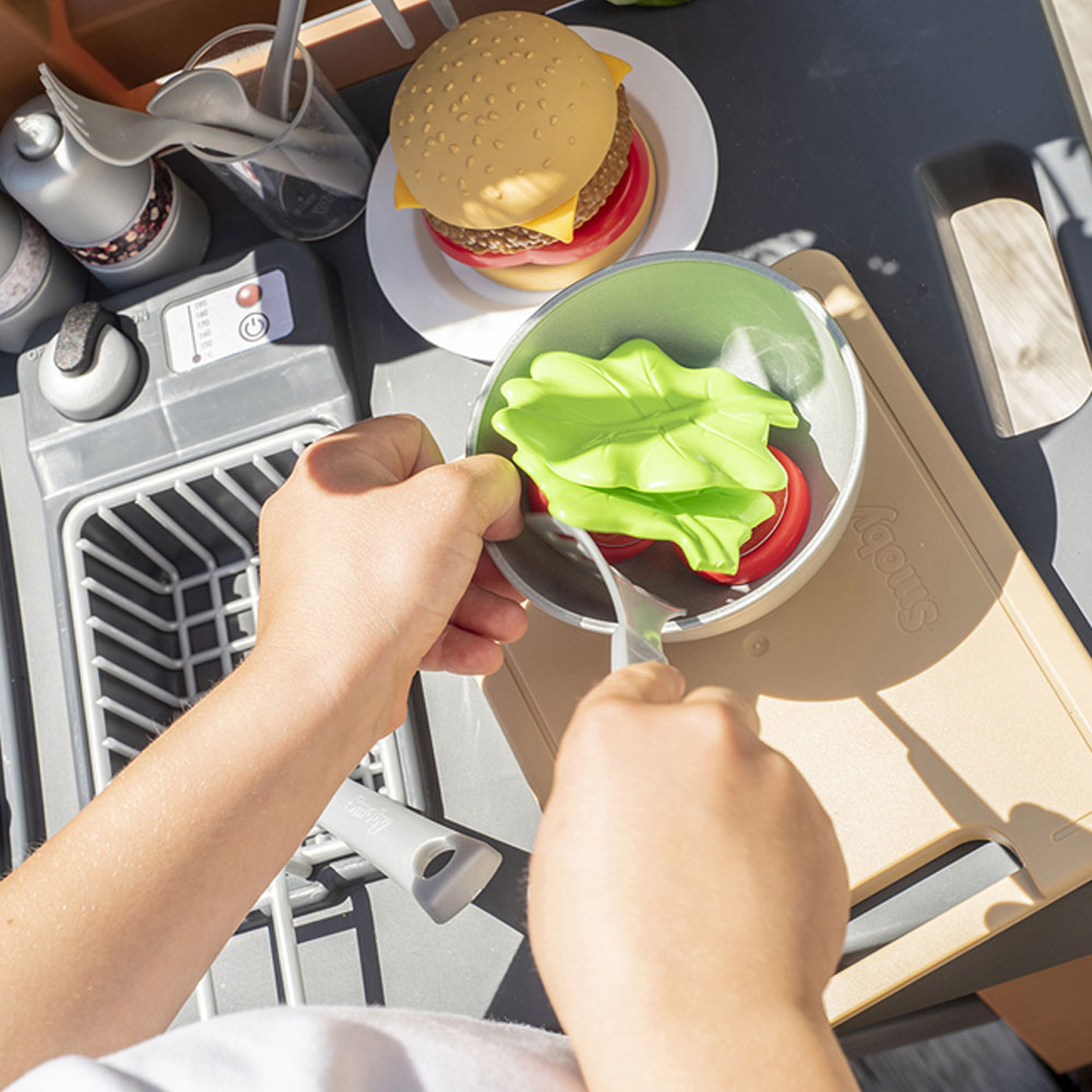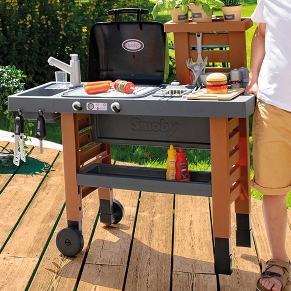 The Garden Kitchen from Smoby is an all-new versatile playset for children who love to cook! Containing over 43 accessories, it is a charming cooking station complete with a grill, sink area with a water pump and spacious countertop perfect for slicing, dicing, and preparing food. They will love copying mum and dad in their grilling station and put their skills to the test with mini utensils, food, and crockery. Whether they want to grill some burgers, assemble kebab skewers, or grow some herbs, the possibilities are endless. Ideal to encourage outdoor fun, the garden grill set is treated with an anti-UV coating to ensure long-lasting quality and colour resistance over time, even in sunlight. Your child can grow their self-esteem, imagination and hand-eye coordination through play and take pride in their role as a chef. Suitable for children over three years of age, the playset grows with your child thanks to its adjustable legs - simply increase the countertop height by 6cm and extend the fun for the whole family. The garden kitchen set is made with sturdy, child-safe materials and includes moveable wheels and a handle for easy transportation.