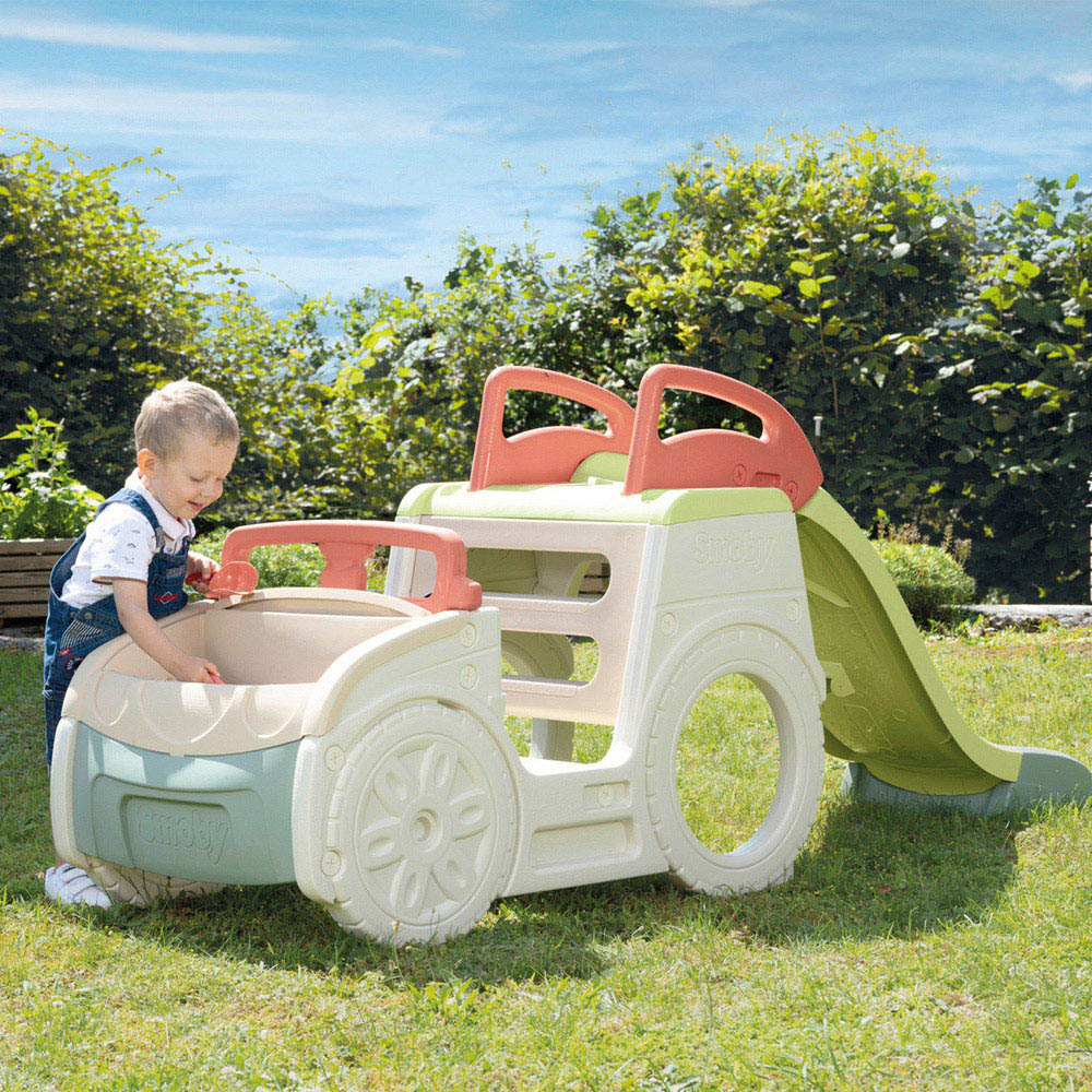 The Smoby Life Adventure Car is an outdoor game that will delight your children with the many activities it offers! Your children will be able to enjoy their new car from their 18 months! They will imagine driving it thanks to the steering wheel which turns, the mechanical key and the horn. While one becomes a real driver, the other will have fun with the playground slide and its glide of 1.50m! You will have nothing to worry about your children’s safety because the slide has an ergonomic ladder and anti-skid steps. During hot and sunny days you can join a hose under the slide to create a waterfall and cool your little ones! The Adventure Car also offers a sandpit, under the car’s bonnet. The lid will enable the sand to be protected from the wind and rain (sand not included). The sandpit is removable for easy and quickly cleaning! The plastic pieces are Anti-UV treated ensuring a good resistance and colour durability over time. This toy contains recycled material. Assembled dimensions: W233 x D68 x H91 cm.