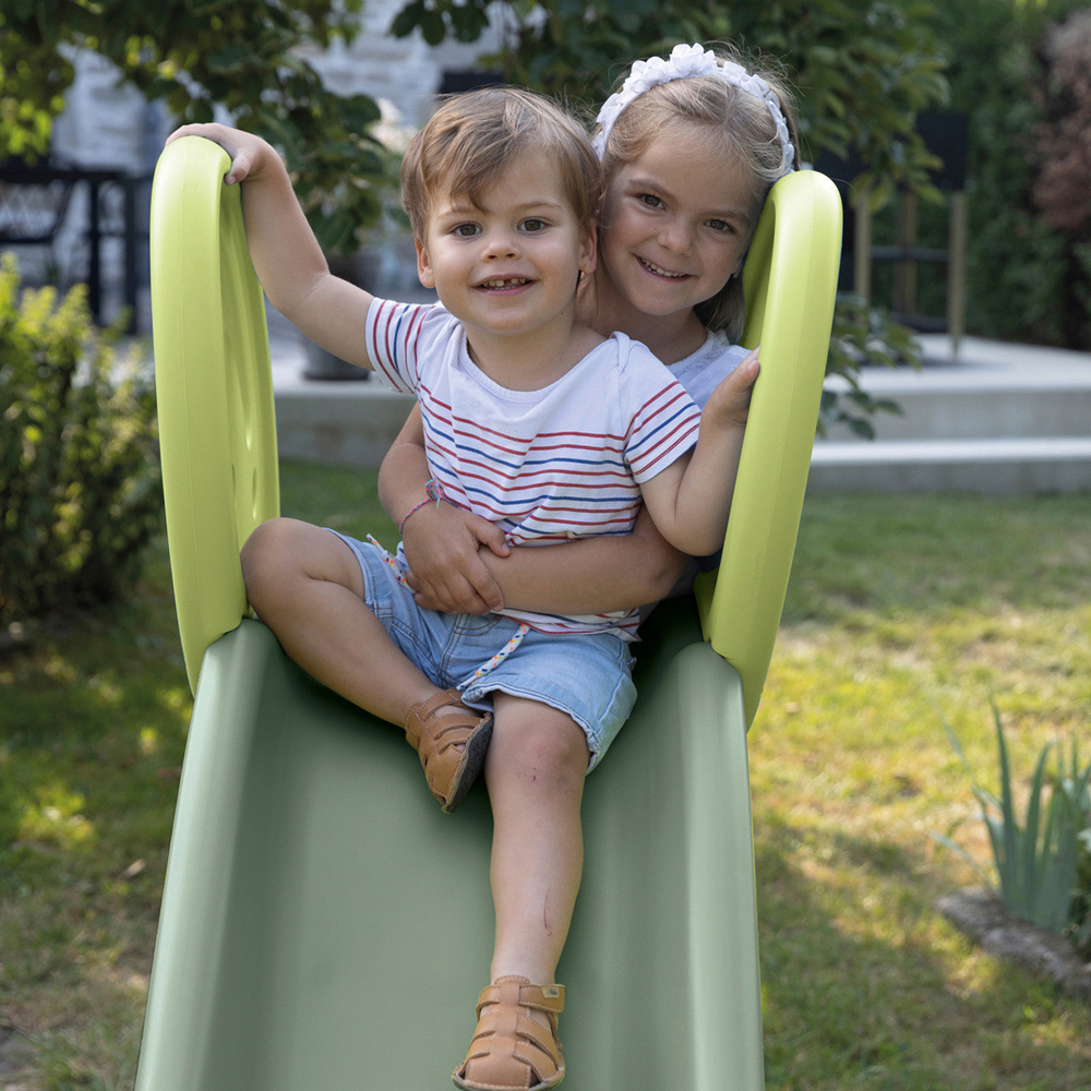The XL slide with its double wavy length of 2.3m will amuse your children for hours! Fitted with an extra-wide base which offers very good stability, and a ladder equipped with ergonomic handles and non-skid steps, the Funny slide enables you to have no worries about safety! Sunny days will be even more enjoyable because you can connect a hose under the slide to create a waterfall and cool your little-ones! Your children will spend whole days having fun and laughing with their friends! The plastic pieces are Anti-UV treated ensuring a good resistance and colour durability over time. User's max weight : 50kgs. This toy contains recycled material. Assembled dimensions: W237 x D112 x H142 cm.