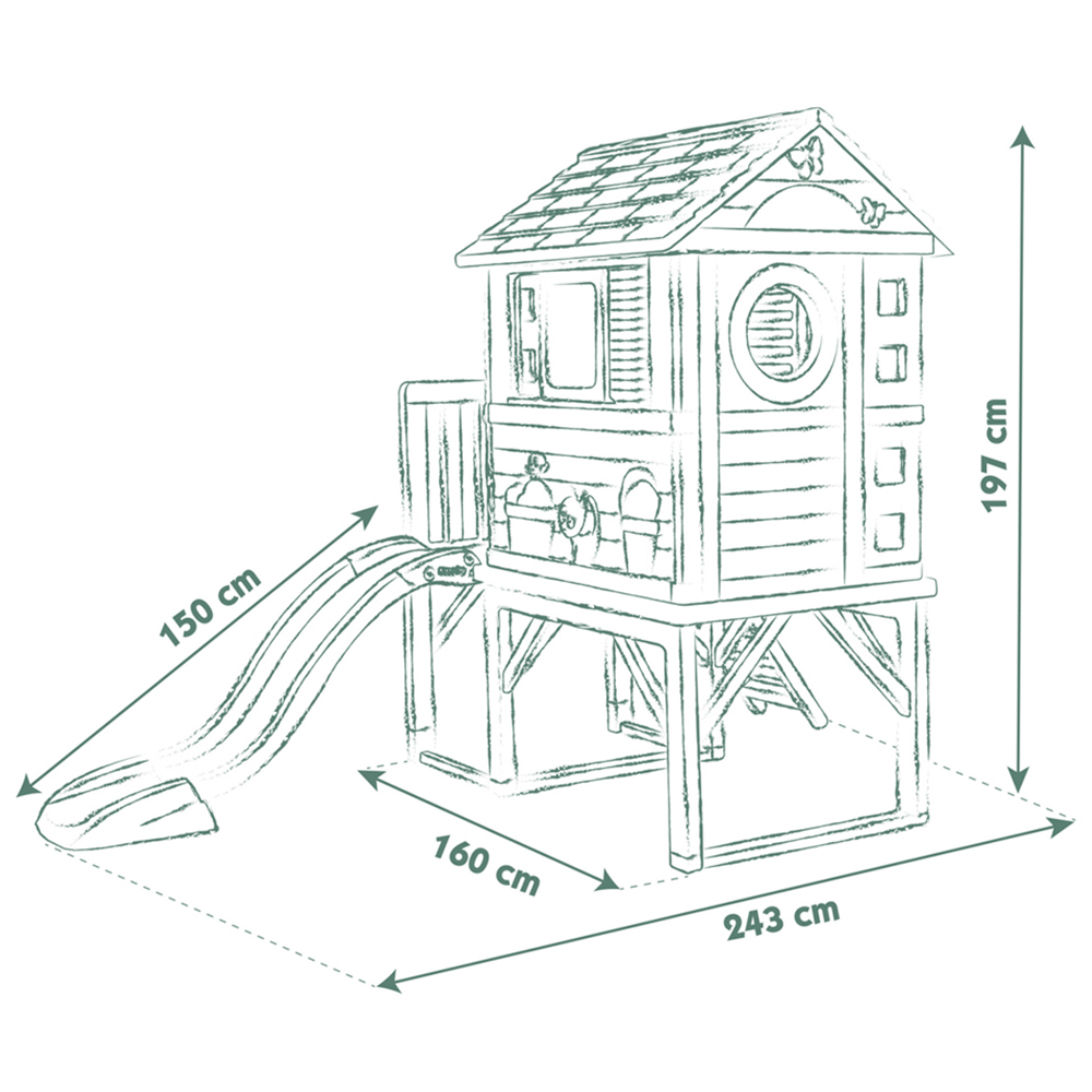 The Playhouse on Stilts is perfect to have fun with friends and develop imagination! Like real adventurers, your children will be able to reach their hut thanks to the ladder. Set on a 70cm high platform, the playhouse gives an unobstructed view of the garden. Thanks to the half door and the 3 windows on the different facades, your little adventurers will have an eye on everything! While one of your children will have fun with the slide, the other will be able to imagine thousand stories on the house’s porch! Your little ones will be able to play hide and seek thanks to the 2 sliding shutters which will enable them to win the game! For more fun, you can add an electronic doorbell (not included, sold separately): your children will be warned of their friends’ arrival then! This hut will quickly become their favourite place to have fun all day long! In addition to being made with solid materials, the playhouse is anti-UV treated to guarantee its sturdiness and its colours’ durability over time! This toy contains recycled material. Assembled dimensions: W243 x D160 x H197 cm. Suitable from 2 years.