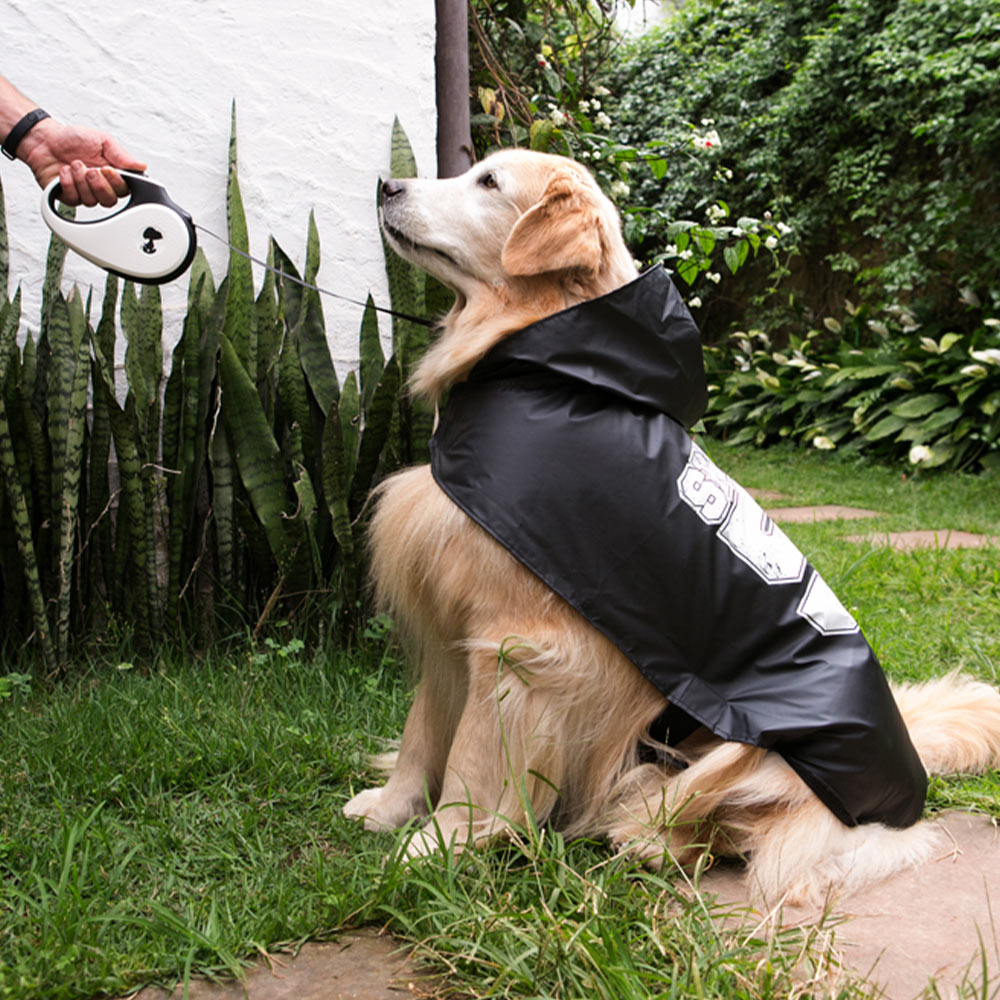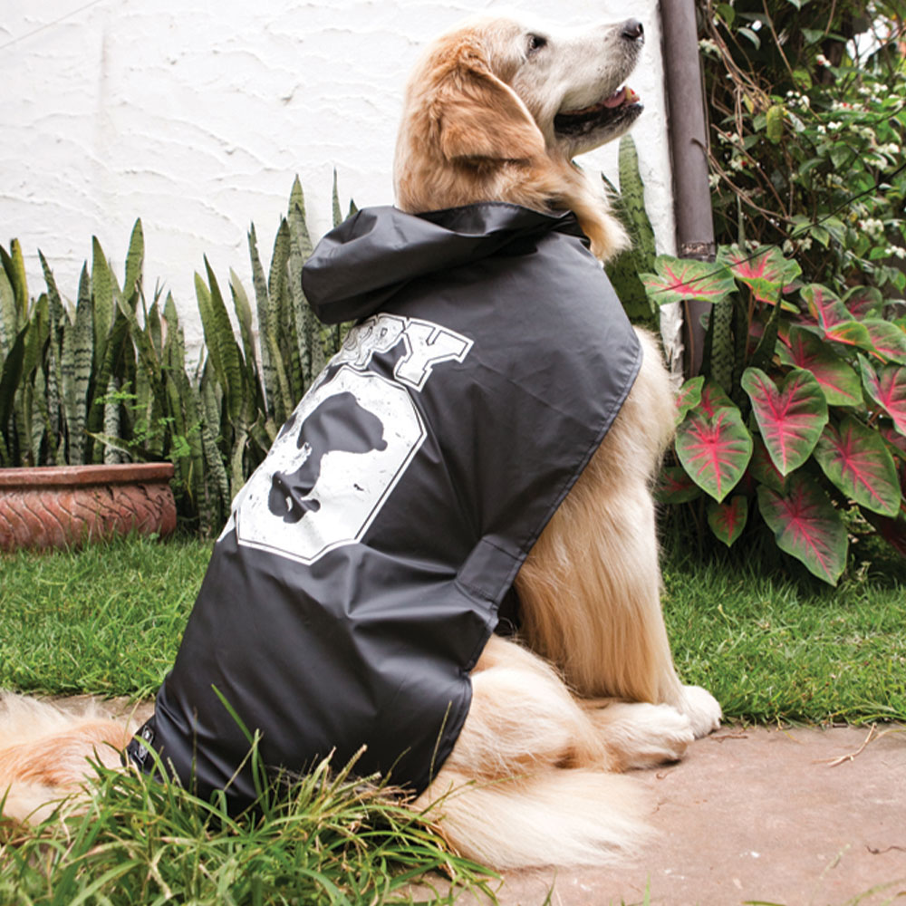 Protect your pet from getting wet with a Snoopy Black waterproof raincoat. This raincoat comes with a hook and loop fastener adjustable strap and elastic and is comfortable for the hind legs. The top hole makes it easy to hood your leash onto your dog’s collar or harness. This coat also comes with a bag that facilitates its transport.