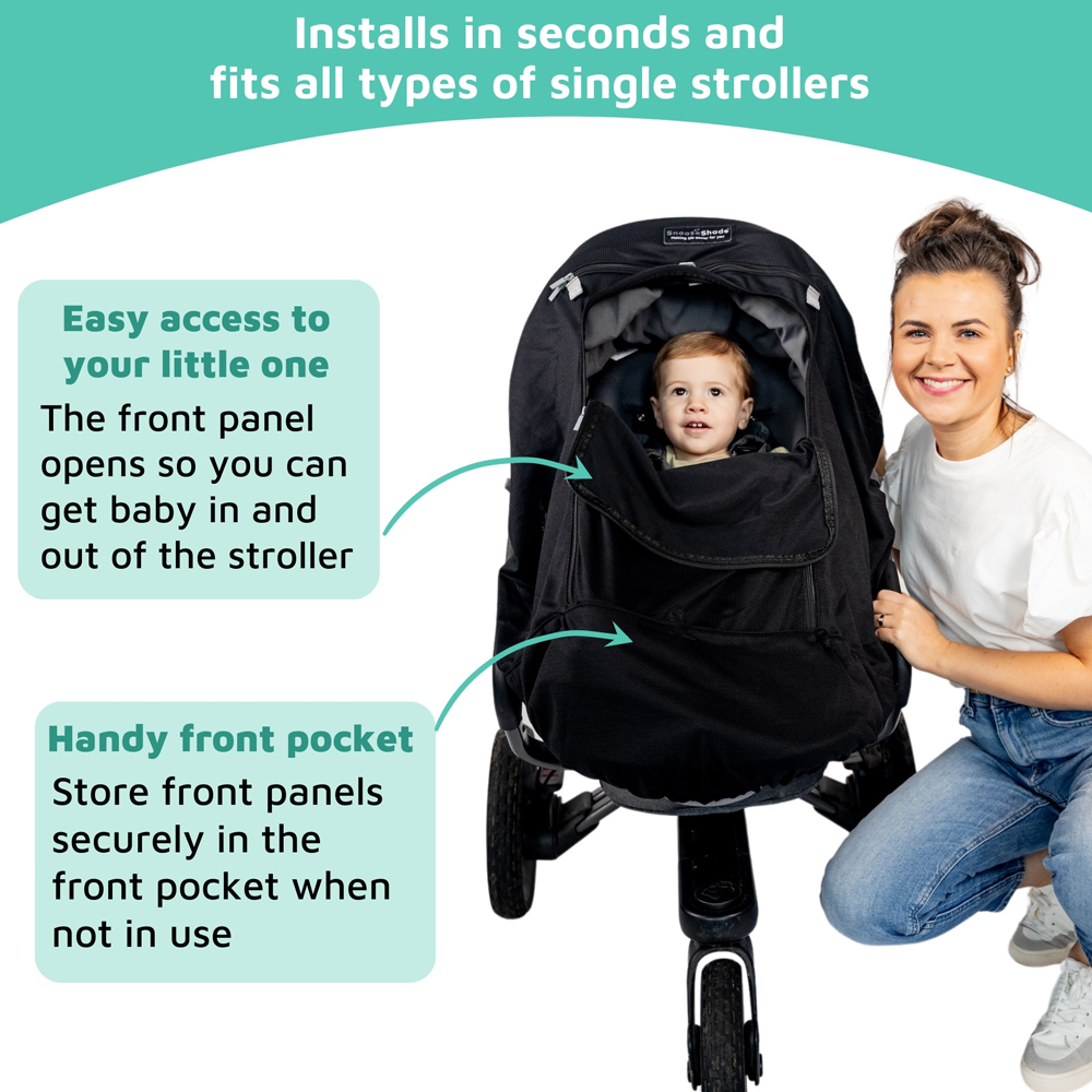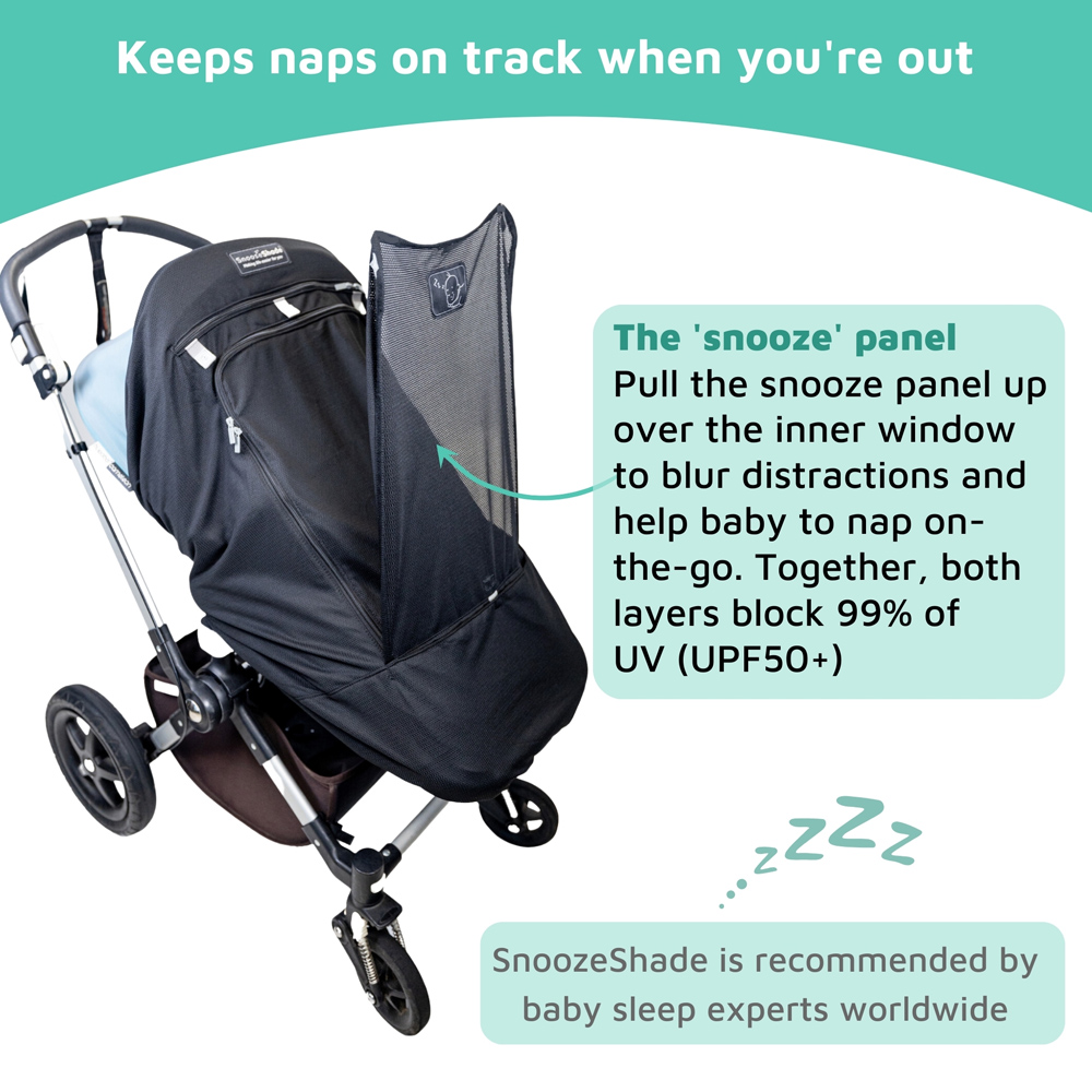 Let your baby enjoy the outdoors as much as you do with this Snoozeshade Plus Extra Sun Shade. This shade is designed for your little one sitting in the stroller seat. Being three times bigger than the Original version, this cover safely shades longer toddler legs and boasts additional functionality for children who want to see out when awake. It safely protects your child from up to 99% UV rays and helps keep their nap routine on track while you're out and about. Also, if your little one doesn't like sunglasses it's the perfect choice as the front panel window blocks 80% UV and lets the baby see out. Plus, the front can be fully or partially open or closed to provide maximum flexibility. This award-winning sun and sleep shade quickly and easily fits any single-width pushchair or stroller with a hood. Moreover, it lets air flow freely, thanks to its air-permeable mesh fabric.