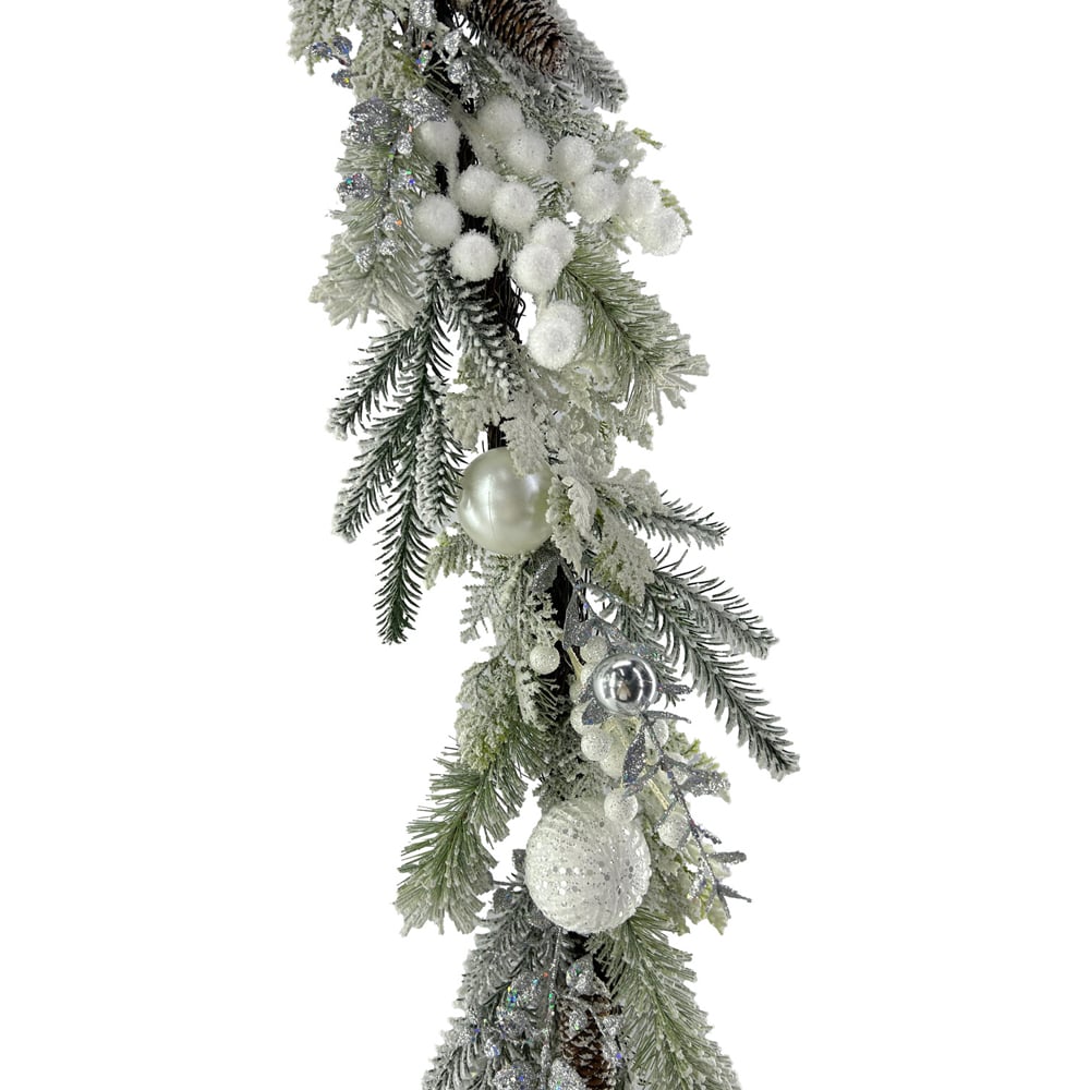 Create a serene, snow-dusted statement in your holiday decor with this Snowy Pine Bauble Garland. This elegant garland brings the peaceful charm of a frost-kissed forest indoors. With hyper-realistic pine branches dusted in snow flocking and a carefully curated mix of shimmering baubles in wintery hues, it effortlessly elevates mantels, staircases, entryways or festive tablescapes. Whether styled as a centrepiece or draped as a border, it conjures up a magical woodland winter right at home.