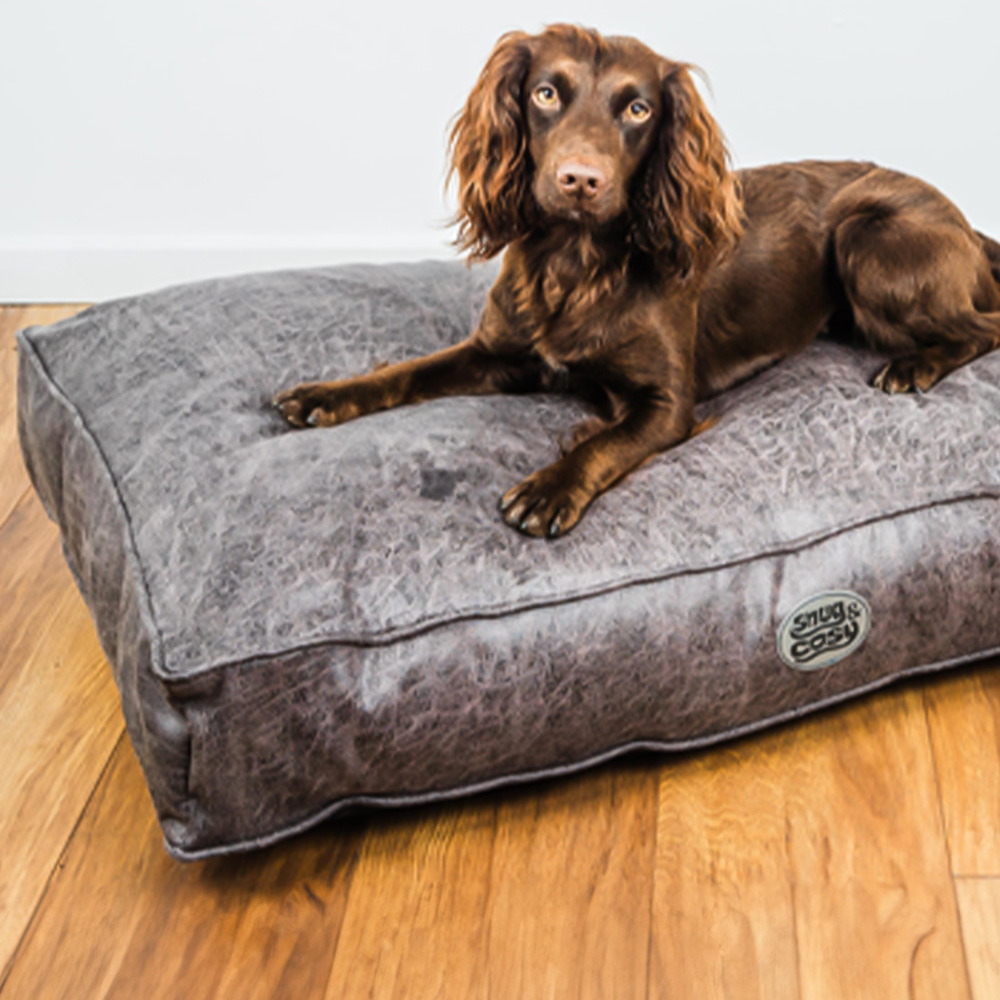 Bring ultimate comfort for your furry friend with Snug & Cosy Rhodeo Medium Faux Leather Dark Grey Pet Lounger Bed. It is made of a dark grey vintage faux leather fabric with a waterproof base.