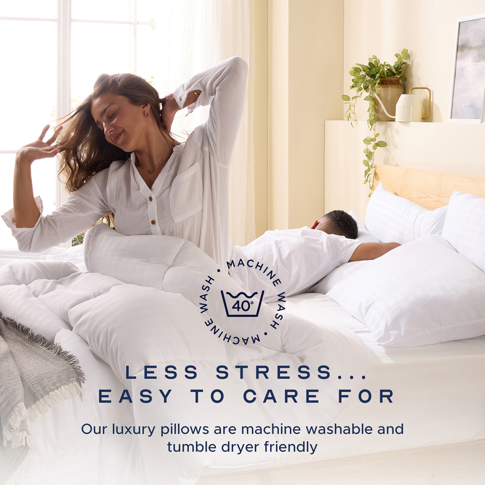 Embrace tranquil simplicity with Snuggledown Scandi Hollowfibre pillows. Generously filled with cosy hollowfibres and encased in a soft touch 100% microfibre cover. The Scandi Hollowfibre pillows feature a medium level of support, which is ideal for side and back sleepers. All Snuggledown synthetic pillows are hypoallergenic, which means they're unlikely to trigger common allergies. The pillows are machine washable at 40° and can be tumble dried. All Snuggledown pillows and duvets are lovingly produced in the UK, ensuring they meet the highest quality standards, and help you to relax, escape and wind.