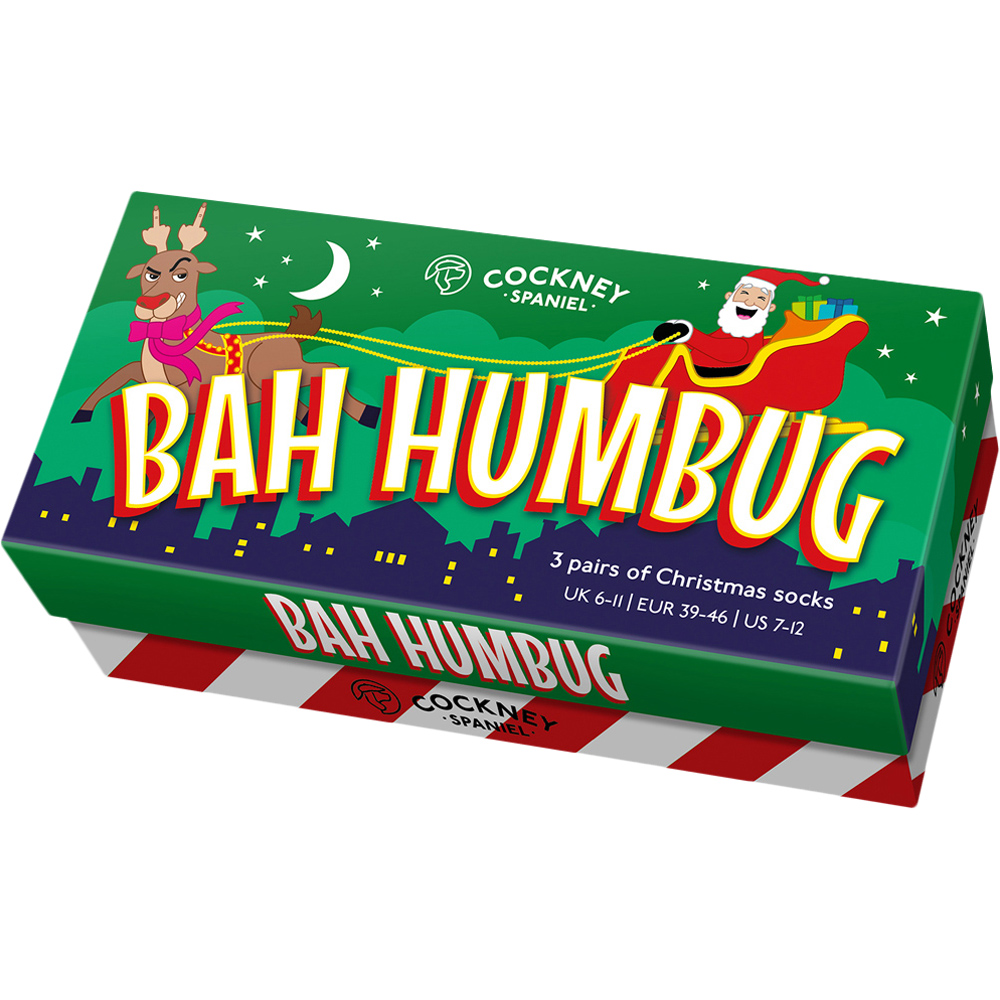 Get ready for the holiday season with this Sock Academy Bah Humbug Christmas Socks 3 Pack. These three pairs of humorous men's socks are perfect for adding some holiday cheer. Each pair features a grumpy character, either a snowman, Santa, or Rudolf, and is adorned with a playful phrase: "Frosty AF," "Bah Humbug," and "Rude-Olf." These socks not only serve as a fun way to encourage the man in your life to embrace the festive spirit but also provide cosy warmth for his feet throughout the winter season. Fun and festive socks for men. Size is UK: 6-11, EUR: 39-46, US: 7-12.