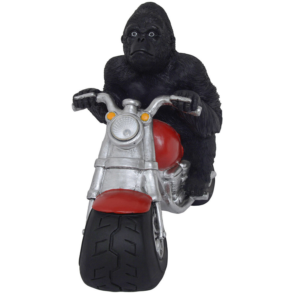 This fun and unique Solar Gorilla Motorbike Statue is the perfect addition to brighten your outdoor space. With a warm white LED contained in the motorbike headlight and hand-painted statue, this Solar Gorilla Motorbike Statue will be sure to stand out in your garden adding a unique feature to your space.