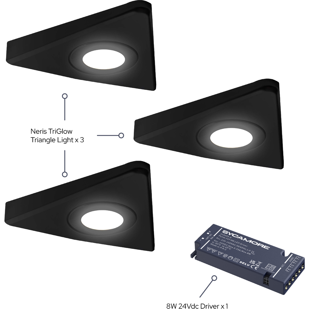 Illuminate your space with this Sorrelis Neris TriGlow Black 3 Light Kit. The Nimbus cabinet light can easily switch between warm white, natural white, and cool white at the flick of a built-in switch — no extra tools or fuss. Whether you’re setting the mood or matching your space’s vibe, TriGlow lets you customise your lighting to create a look that’s uniquely yours! The light has a black finish and is mounted in a surfaced mounted tri-light body. The kit includes 3 x lights, 1 x 24 volt 8 watt driver and 1 x extension lead.