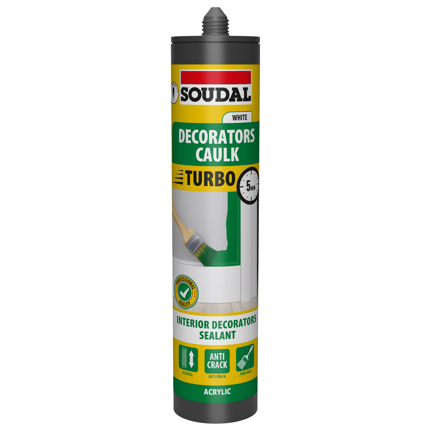 Soudal Turbo Decorators Caulk is a rapid-curing paintable sealant that is ideal for a variety of jobs in and around the home. This interior decorators sealant is useful for the sealing and filling of gaps or joints prior to decorating, perfect for that smooth professional finish. This turbo acyclic caulk can be painted over in just five minutes, making it ideal for when you're pinched for time. The flexible formulation provides very good adhesion on many porous surfaces.