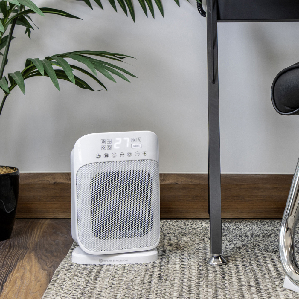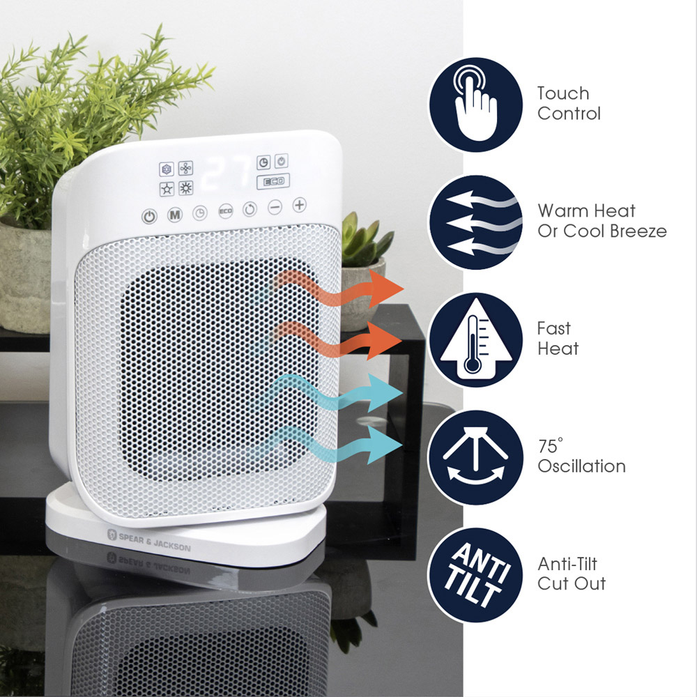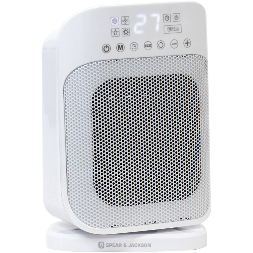 The Spear & Jackson Digital PTC Digital Heater is a portable, quiet, and lightweight ceramic fan heater. Its small size makes it perfect for placing on a table or on the floor, especially in small spaces in your home or office. With dimensions of 29 x 19 x 14cm, it is recommended for heating areas up to 15m2. This heater is equipped with a digital LED display for easy operation and utilizes a PTC ceramic heating element for quick and efficient heating. It also has a 24-hour timer function and an energy-saving 'eco' mode for reduced energy consumption. The ceramic fan heater has an adjustable thermostat with a temperature range of 10/35 degree Celsius. Additionally, it features a 75-degree oscillation function and a cool wind setting, which is useful during warmer months. For added safety, this PTC fan heater has overheat protection and a safety tip-over switch. It can be controlled through touch and has options for warm heat or cool breeze.