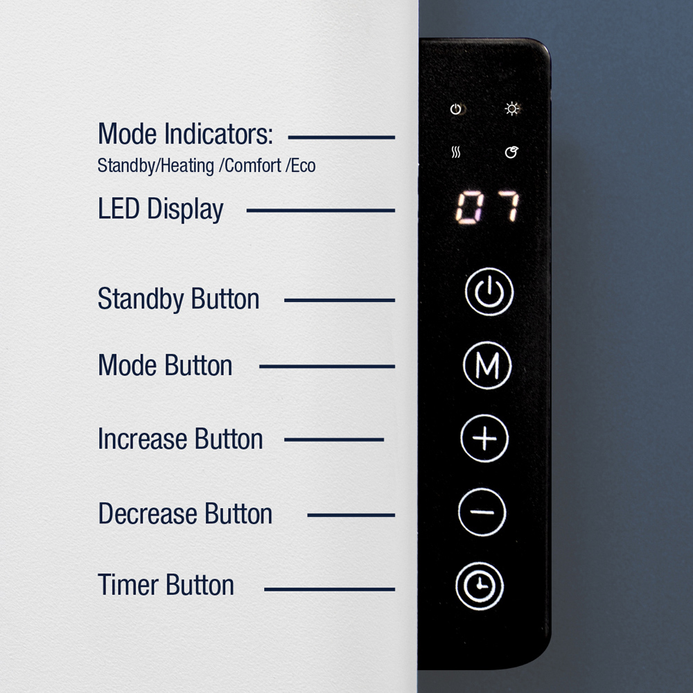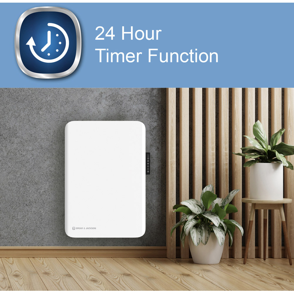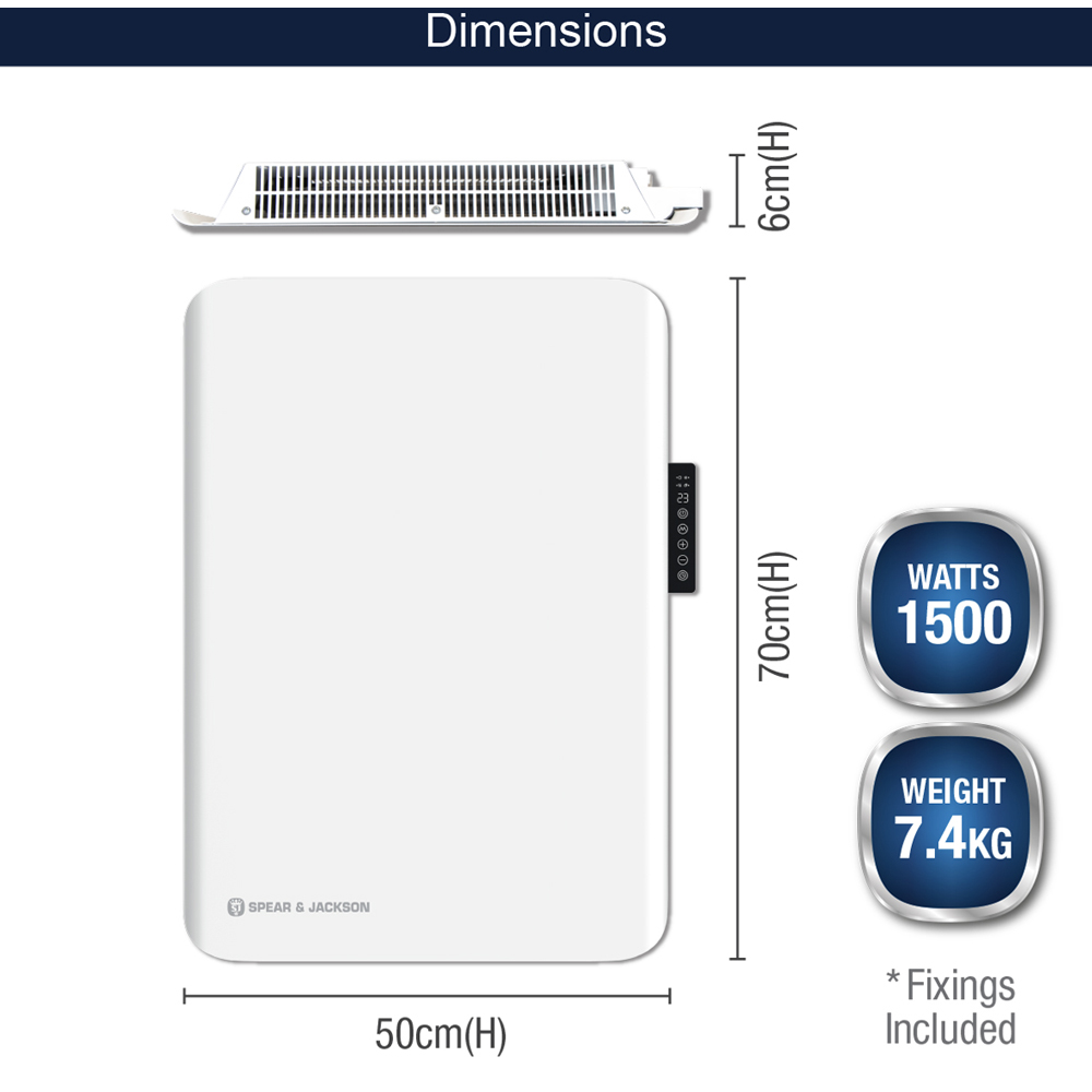 The Spear & Jackson Panel Wall Heater 1500W is a sleek and efficient heating solution for your home. With dimensions of 70 x 50 x 6cm, it is ideal for heating spaces up to 20m2 and can reach maximum temperatures of 35 degree Celsius. This heater is equipped with a digital LED display for easy operation. It offers a comfort mode with automatic temperature adjustment and will automatically turn off if it detects open windows to conserve energy. Additionally, it has an energy-saving 'eco' mode for reduced power consumption. This wall-mounted heater can be easily controlled with an on and off power switch. It provides peace of mind with its overheat safety protection and comes with brackets and instructions for simple installation. The instruction manual also provides a detailed explanation on how to set a customized weekly program to suit your specific needs. Furthermore, the 24-hour timer function allows you to set a desired time, and the heater will automatically switch off once the time is up. The touch button control panel and LED display make operating this heater a breeze. Fixings are included for your convenience.