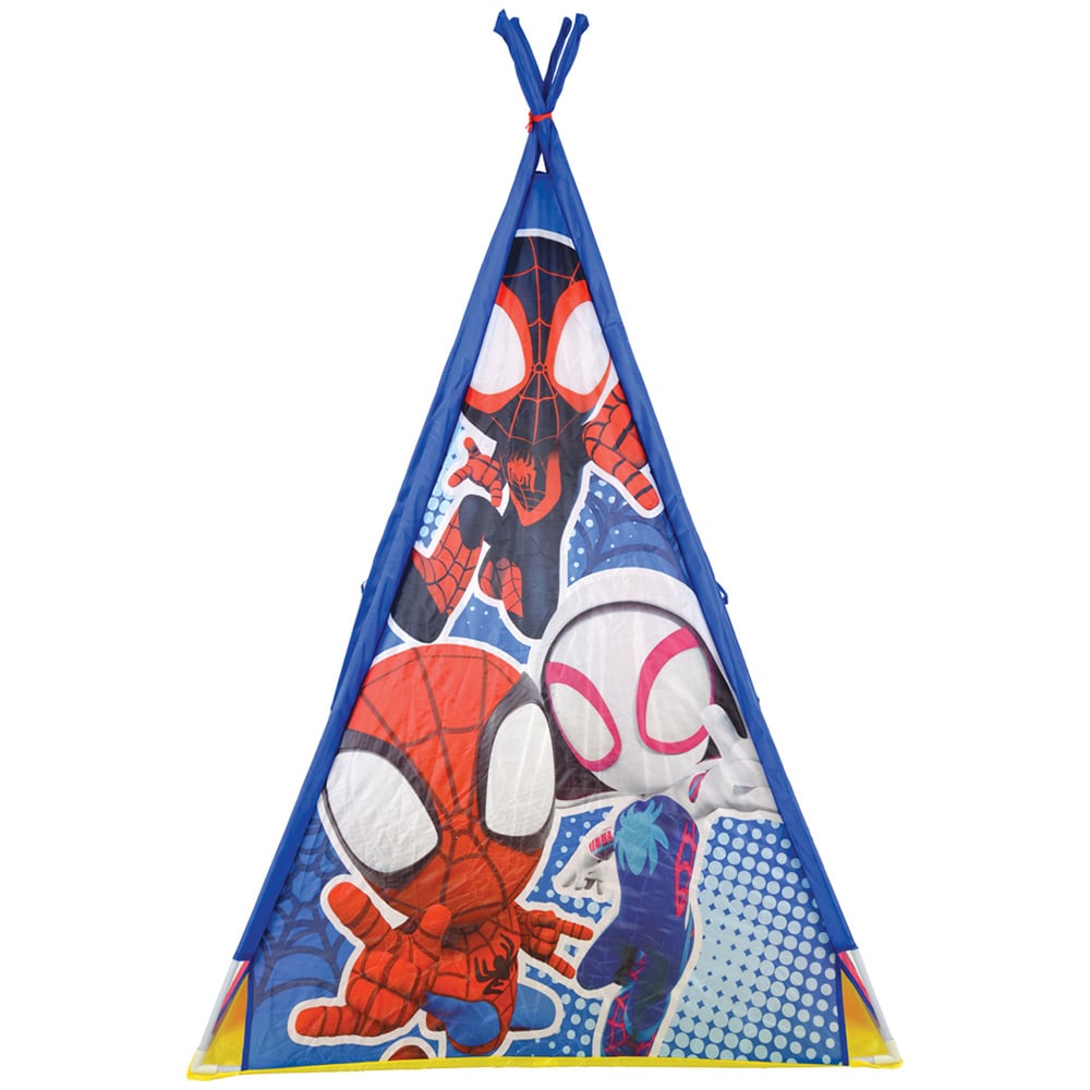 Let imagination, creative play and adventure follow you with the Spidey and His Amazing Friends Tepee. Suitable for ages two years, this is the perfect tepee for children as they start to explore imaginative play and independence. Decorated with character graphics, the tepee comes complete with a closed top and integrated floor, and durable polyester and PVC materials as well as water resistance, perfect for any fan to immerse themselves in play indoors or outdoors. Easy to assemble; the tent is a one-piece design which is shaped by inserting the adjoining PVC poles through readymade channels. The whole product folds down to a compact size for easy storage. It also comes with a carry bag ideal for transporting to sleepovers. Dimensions: H 150 x W 104 x L 104cm.