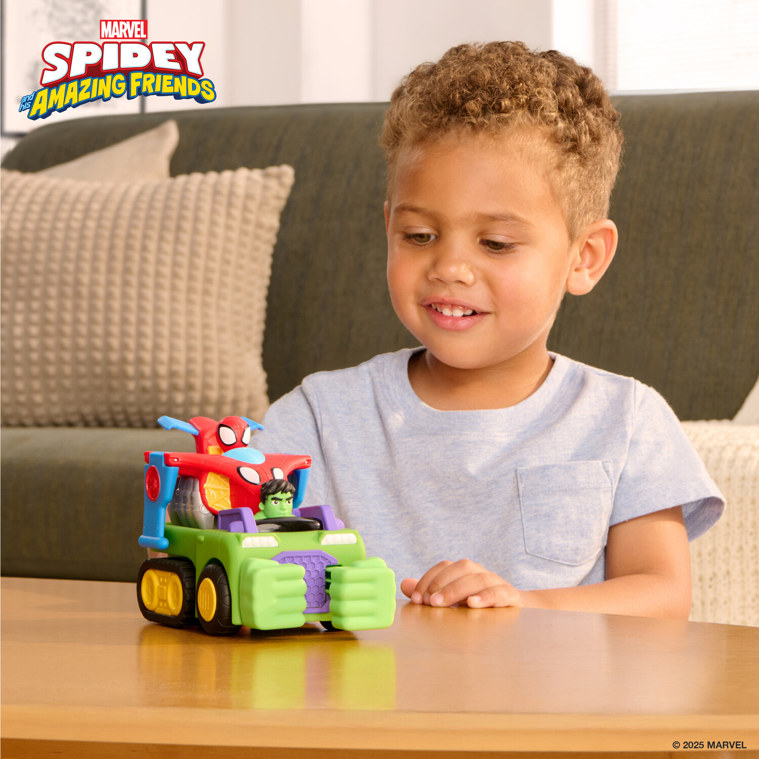 Get ready for some action-packed fun with the Spidey Team Up Tank. Featuring the heroic duo of Spidey and Hulk, these vehicles allow you to join forces and stop villains. The Hulk tank can be pushed forward to activate its punching fists while the Spidey glider jet features folding wings to combine with the Hulk tank. When it's time to split up, simply launch the Spidey glider jet and watch its wings pop back up on their own.