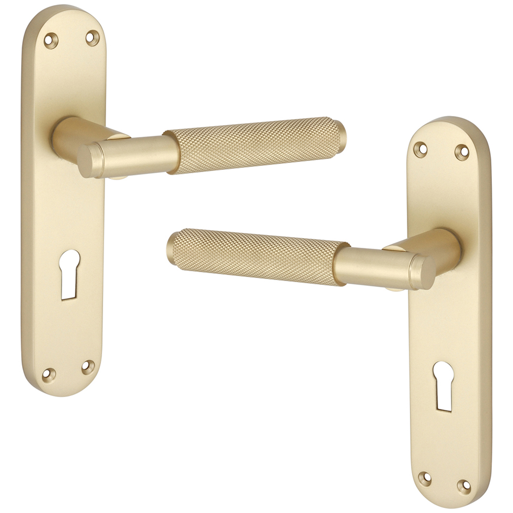 The contemporary style 'Connaught' internal door handles, pair on a sprung shaped backplate, feature a knurled design that feels comfortable and tactile with a straight lever handle design. This can be used on their own, for regular passage doors, with sash lock, Euro lock or bathroom lock if security/privacy is required. Connaught Lever on Backplate Specifications: Material: Aluminium & Zinc. Backplate Height: 185mm. Backplate Width: 40mm. Handle Length: 115mm. Handle Projection: 52mm. Backplate Thickness: 10mm.