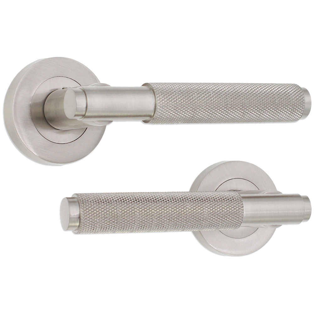 The contemporary style 'Connaught' internal door handles, pair on a sprung rose, feature a knurled design that feels comfortable and tactile with a straight lever handle design. This can be used on their own, for regular passage doors, or can be combined with locking or bathroom escutcheons if security/privacy is required. Connaught Handle Specifications: Material: Aluminium & Zinc. Rose Diameter: 52mm. Lever Length: 115mm. Projection: 60mm.