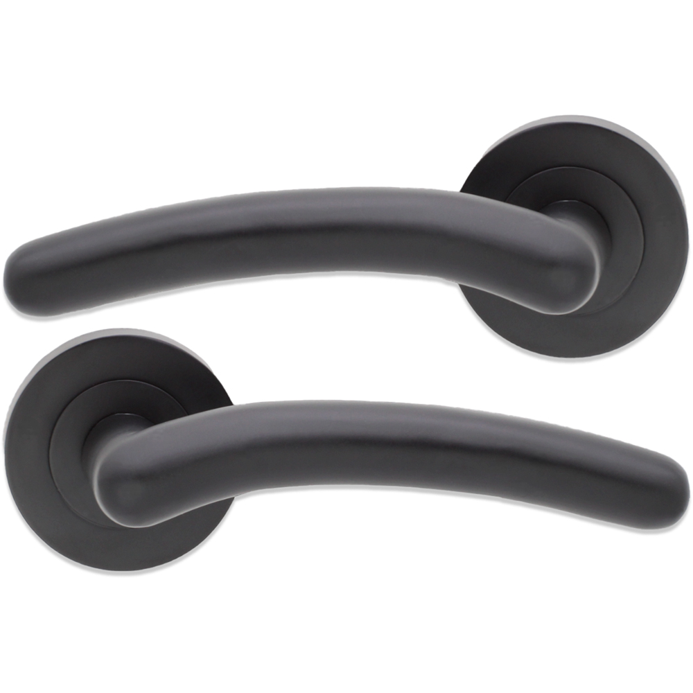 This contemporary in style Taurus internal door handle, pair on a sprung rose, feature a smooth touch finish that feels comfortable and tactile with a curved bar handle lever design. This can be used on their own, for regular passage doors, or can be combined with locking or bathroom escutcheons if security/privacy is required. Taurus Handle Specifications: Material: Aluminium and Zinc. Rose Diameter: 52mm. Lever Length: 110mm. Projection: 52mm.