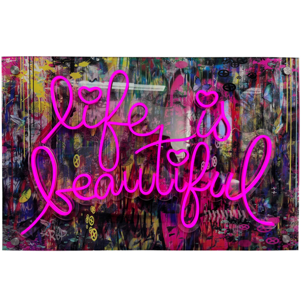 Illuminate your space with the enchanting 'Life is Beautiful' LED Neon Wall Art, a radiant blend of modern design and heartfelt expression. This unframed neon LED light wall decor features a graffiti-style acrylic background that adds a contemporary flair to any setting, be it your home or office. Installation is a breeze thanks to the pre-drilled holes and included mounting hardware, ensuring you can enjoy the warm glow of this eco-friendly, energy-efficient LED sign without any hassle. Perfect as a gift or a personal treat, let this artwork celebrate love and brighten your world.