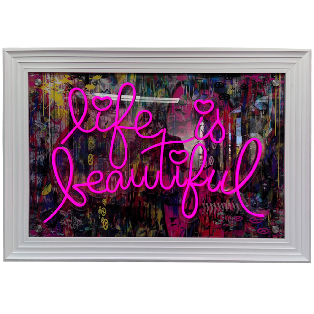 Brighten your world with the enchanting 'Life is Beautiful' LED Neon Wall Art, elegantly framed in a premium white gallery frame. This radiant artwork combines modern design with heartfelt meaning, featuring a graffiti-style acrylic background that is perfect for any setting, from homes to offices. Its easy installation, with pre-drilled holes and included mounting hardware, ensures you can hang it up and enjoy its warm glow without any hassle. The energy-efficient LED lights not only provide a long-lasting illumination but also make this piece an eco-friendly choice for art lovers.