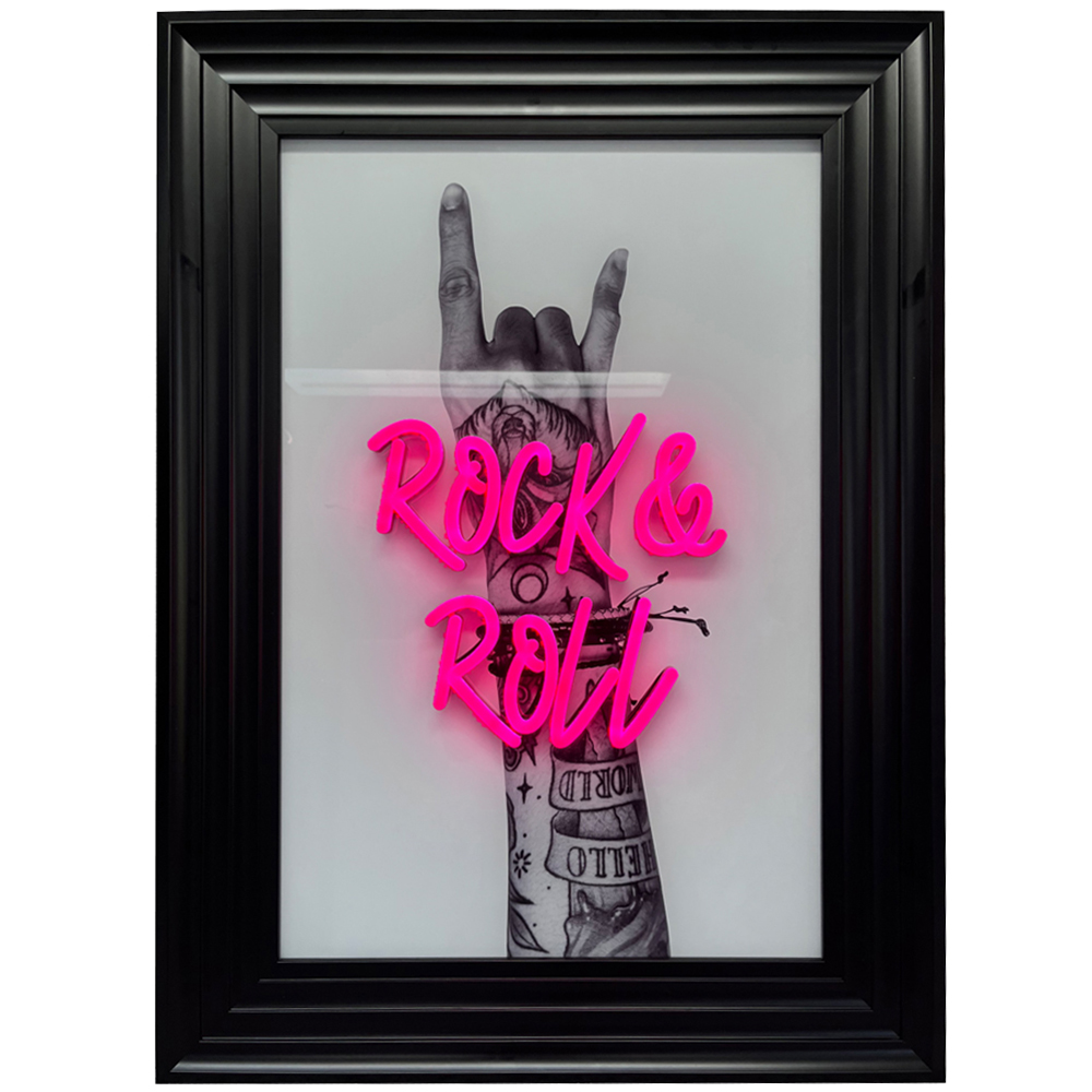 Brighten up your living or working space with the 'LED Neon Wall Art - Rock and Roll', a radiant piece that not only lights up the room but also brings a touch of heartfelt, modern design. This captivating artwork features a graffiti-style acrylic background and is encased in a Black premium gallery frame, making it a perfect fit for any room or office. It's also an ideal gift for music lovers or anyone who appreciates vibrant decor. Installation is a breeze with pre-drilled holes and all necessary mounting hardware included, ensuring you can enjoy the warm, eco-friendly glow of the LED lights without any hassle.