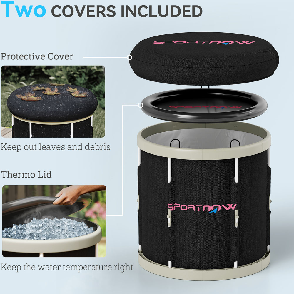 Experience recovery and rejuvenation with the SPORTNOW Ice Bath Tub. Designed for adults up to 1.75m and 75kg, this portable tub (70 x 65cm, 210L) features protective inflatable covers to maintain a great cold plunge. Easily foldable for convenient storage and comes with a carry bag, making it suitable for soothing sore muscles and relaxation on the go. Comfortable design: This portable bathtub measures 70 x 65cm with a 210L capacity, suitable for adults under 1.75m in height and 75kg in weight, making it a snug and efficient ice bathtub. Robust construction: This ice plunge tub features six layers of thermo-insulated materials, including 600D waterproof Oxford fabric, plastic and PE foam. Aluminium support poles ensure stability and a secure setup. Two covers: Features a protective cover to keep out leaves and debris and an inflatable cover to maintain optimum water temperatures in your cold plunge tub, enhancing your ice bathing experience.