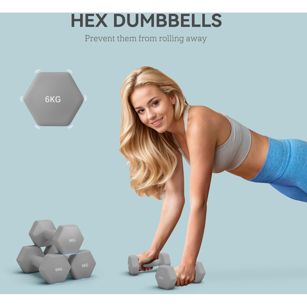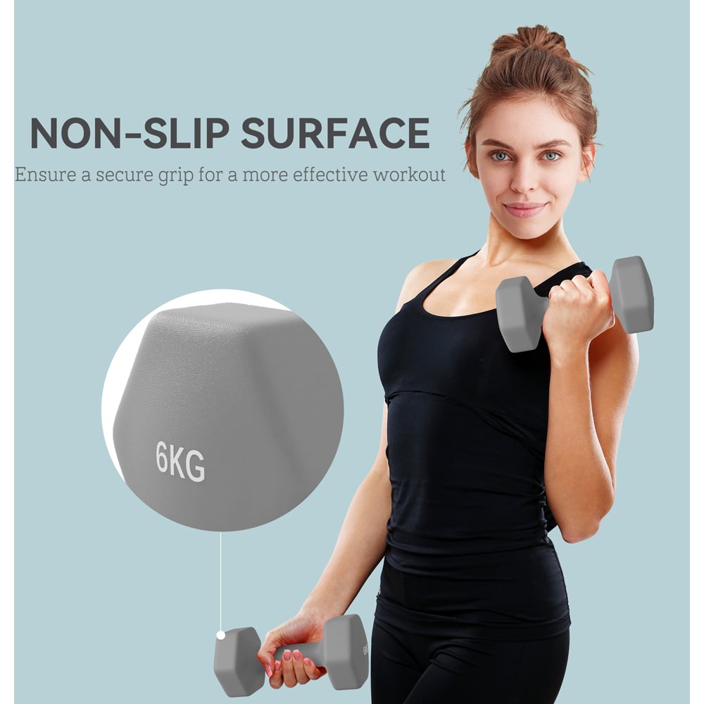 Exercise at home with the SPORTNOW dumbbell set. Featuring two hand weights, they're great for bicep curls, shrugs, lunges and much more. Its hexagonal shape stops the weights from rolling off – they'll stay right where you left them. Non-slip handles ensure a secure and comfortable grip, so you can work out confidently. Convenient and easy to use, turn your home into a mini fitness centre, keeping you active and healthy. Plastic covering: These weight sets are designed to protect your floors from damage.
