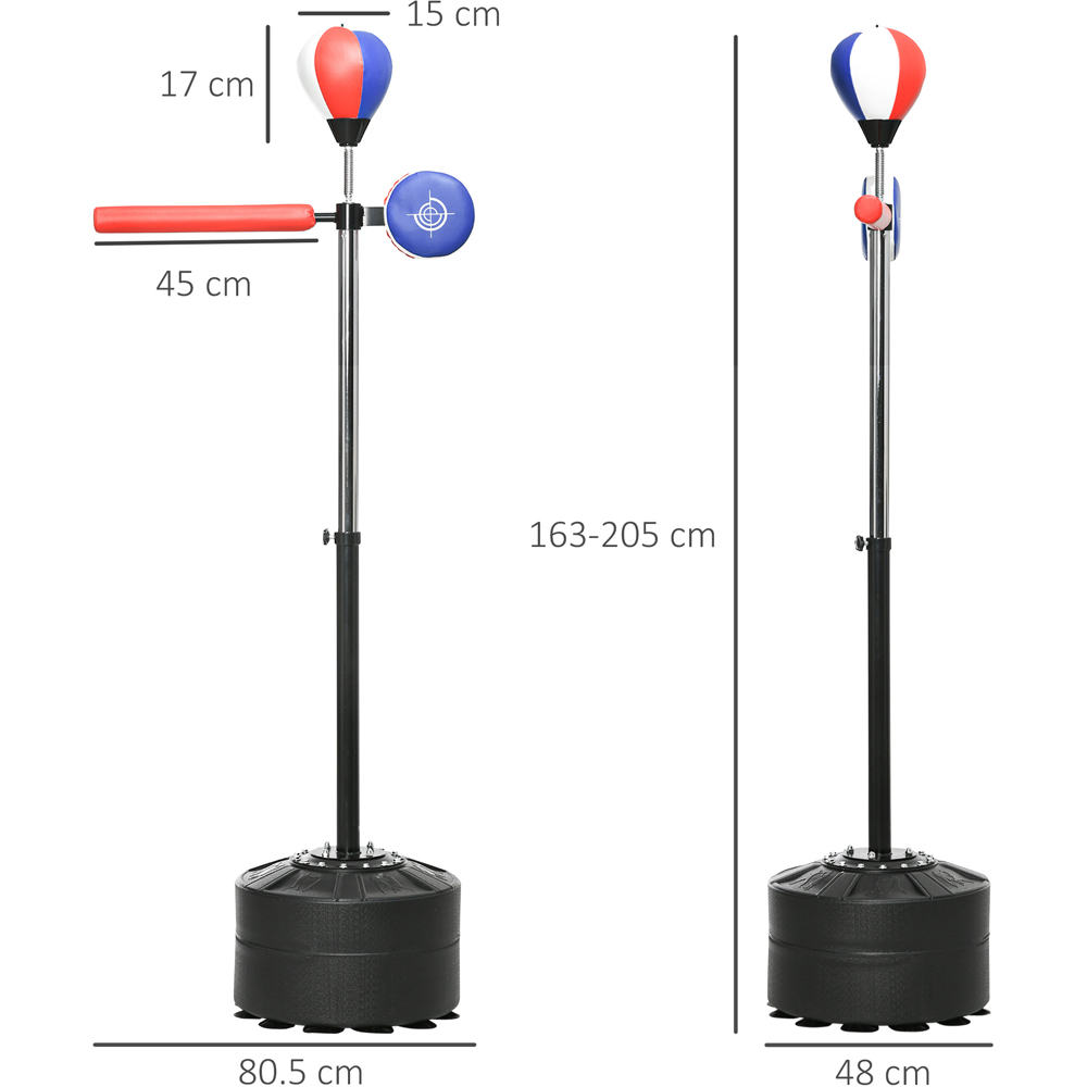 Boxing isn't just about how hard you punch, it's timing, reflex and accuracy. You can now sharpen all your skills, thanks to this SPORTNOW boxing speed bag. Designed to emulate real sparring, it has a reflex bar that rotates on impact, letting you dodge, react and hit back. It's freestanding – the base can be weighed down with sand or water for stability. Hand wraps protect your fists, allowing you to push your limit, so you can improve your ability and become your best possible version. 360° reflex bar: Includes a rotating reaction spar bar, which is great for training your reaction, accuracy and agility. It's designed to emulate a real sparring match. Stable base: Fill the base with water or sand for stability. 12 suction cups underneath, keeping the stand firmly on the floor. The boxing stand stays firm and upright, even when hitting the speed bag hard.