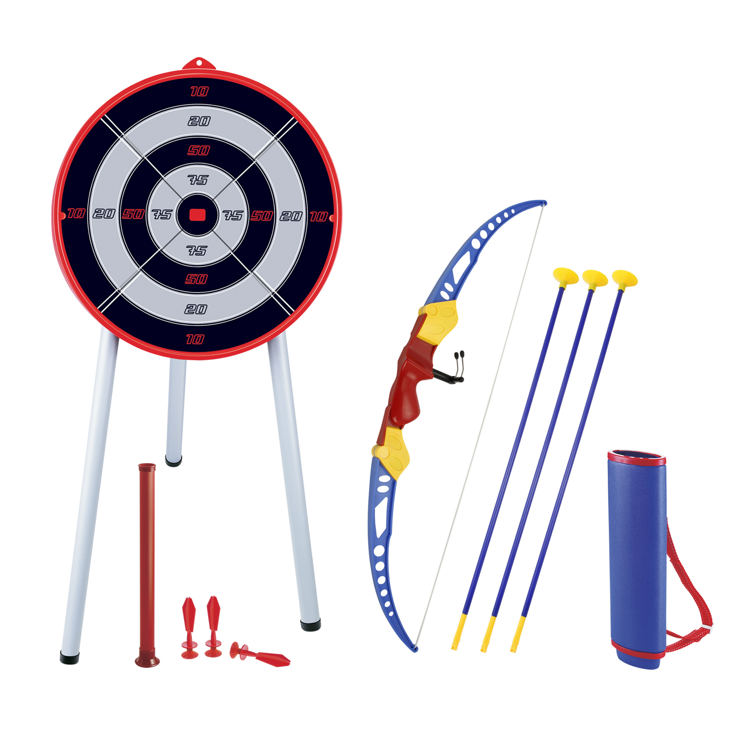 - Includes bow and arrow set, blow-pipe shooter, and standing target