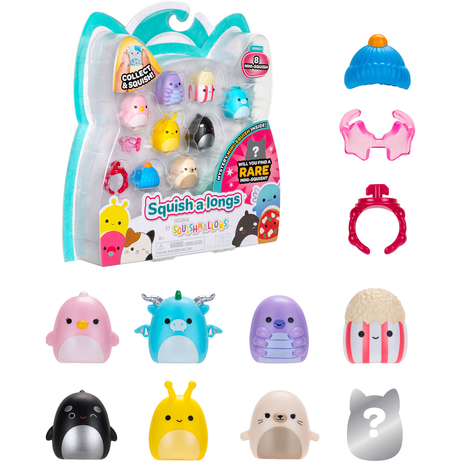 Get ready for a new level of squish with Squishmallows Squishalongs! One inch in size, this adorable and portable collectable is made of squeezable plastic and comes in an assortment of four packs for you to collect, play with and display. Show off your fandom by wearing the ring and dressing your Mini-Squish with fun accessories like glasses and hats. You can ensure you get them all with the helpful collector's guide.